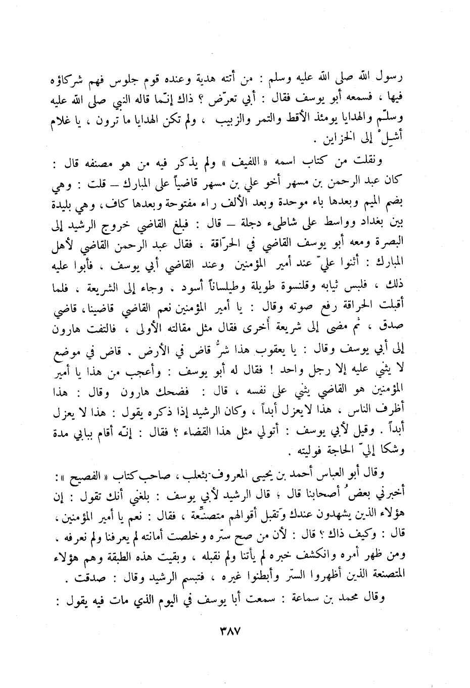 ونقلت من كتاب اسمه " اللفيف " ولم يذكر فيه من هو منصفه قال: كان عبد الرحمن بن مسهر أخو علي بن مسهر قاضياً على المبارك - قلت: وهي بضم الميم وبعدها باء موحدة وبعد الألف راء مفتوحة وبعدها كاف، وهي بليدة بين بغداد وواسط على شاطئ دجلة - قال: فبلغ القاضي خروج الرشيد إلى البصرة ومعه أبو يوسف القاضي في الحراقة، فقال عبد الرحمن القاضي لأهل ذلك، فلبس ثيابه وقلنسوة طويلة وطيلساناً أسود، وجاء إلى الشريعة، فلما صدق، ثم مضى إلى شريعة أخرى فقال مثل مقالته الأولى، فالتفت هارون إلى أبي يوسف وقال: يا يعقوب هذا شر قاض في الأرض، قاض في موضع لا يثني عليه إلا رجل واحد! فقال له أبو يوسف: وأعجب من هذا يا أمير المؤمنين هو القاضي يثني على نفسه، قال: فضحك هارون وقال: هذا أظرف الناس، هذا لا يعزل أبداً، وكان الرشيد إذا ذكره يقول: هذا لا يعزل أبداً. وقيل لأبي يوسف: أتولي مثل هذا القضاء فقال: إنه أقام ببابي مدة وشكا إلي الحاجة فوليته.