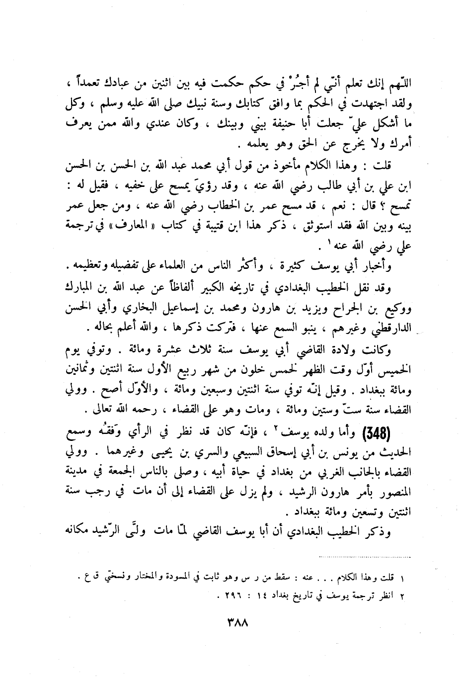 قلت: وهذا الكلام مأخوذ من قول أبي محمد عبد الله بن الحسن بن الحسن بن علي بن أبي طالب رضي الله عنه، وقد رؤي يمسح على خفيه، فقيل له: تمسح قال: نعم، قد مسح عمر بن الخطاب رضي الله عنه، ومن جعل عمر بينه وبين الله فقد استوثق، ذكر هذا ابن قيبة في كتاب " المعارف " في ترجمة علي رضي الله عنه (1) .