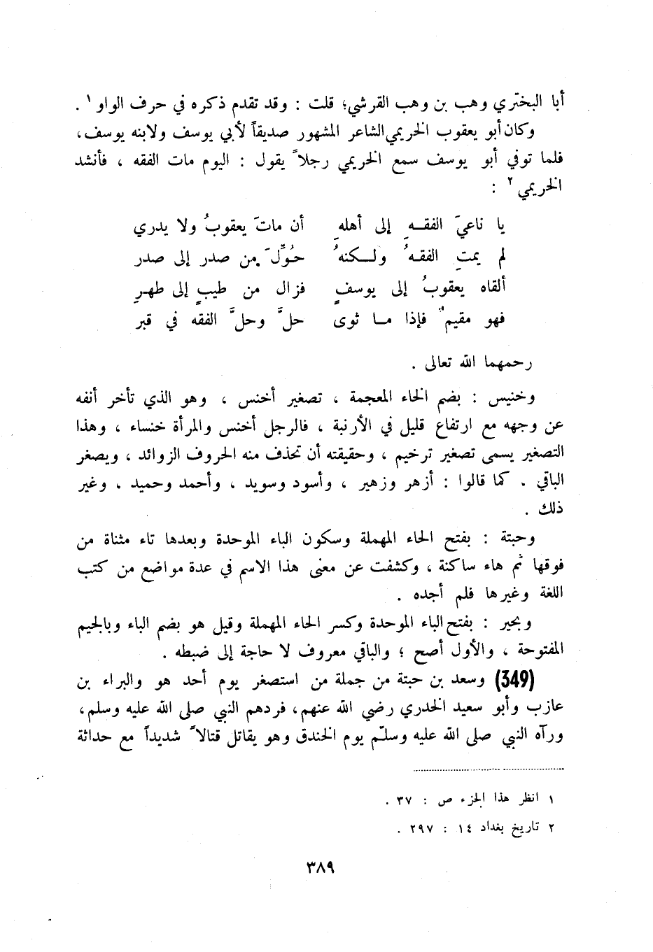 وخنيس: بضم الخاء المعجمة، تصغير أخنس، وهو الذي تأخر أنفه عن وجهه مع ارتفاع قليل في الأرنبة، فالرجل أخنس والمرأة خنساء، وهذا التصغير يسمى تصغير ترخيم، وحقيقته أن تحذف منه الحروف الزوائد، ويصغر الباقي، كما قالوا أزهر وزهير، وأسود وسويد، وأحمد وحميد، وغير ذلك.