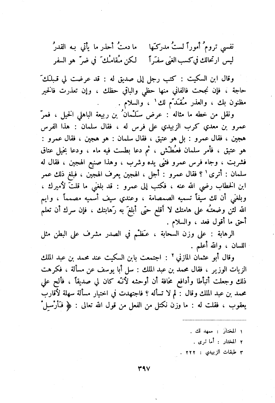 ليس ارتحالك في كسب الغنى سفراً ... لكن مقامك في ضر هو السفر وقال ابن السكيت: كتب رجل إلى صديق له: قد عرضت لي قبلك حاجة، فإن نجحت فالفاني منها حظي والباقي حطك، وإن تعذرت فالخير مظنون بك، والعذر مقدم لك (1) ، والسلام.