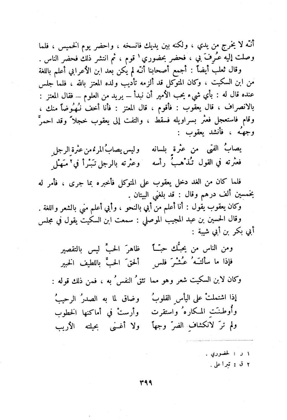 وقال الحسين بن عبد المجيب الموصلي: سمعت ابن السكيت يقول في مجلس أبي بكر بن أبي شيبة: