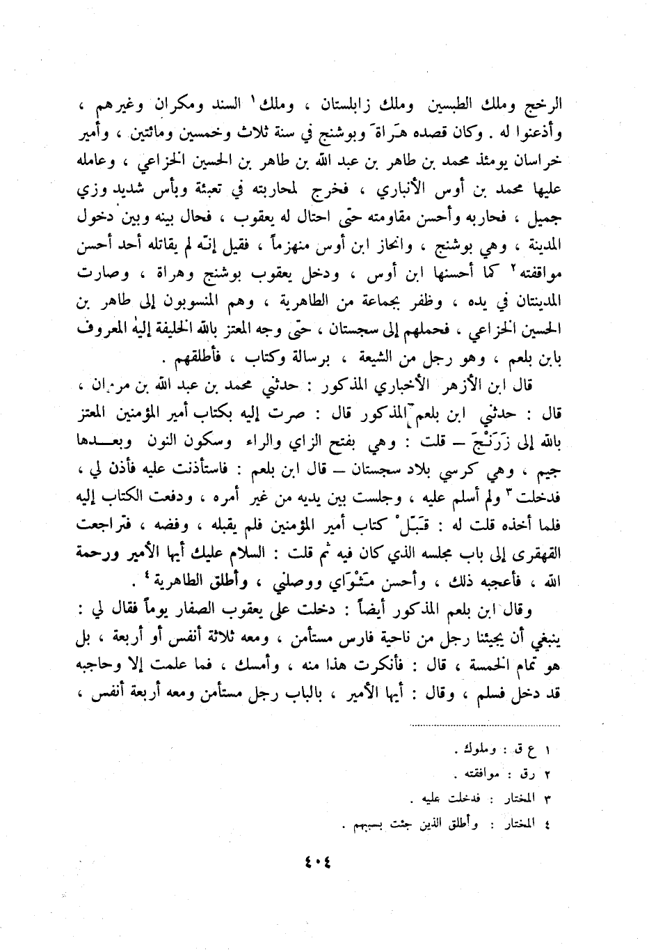 قال ابن الأزهر الأخباري المذكور: حدثني محمد بن عبد الله بن مروان، قال: حدثني ابن بلعم المذكور قال: صرت إليه بكتاب أمير المؤمنين المعتز بالله زرنج - قلت: بفتح الزاي والراء وسكون النون وبعدها جيم، وهي كرسي بلاد سجستان - قال ابن بلعم: فاستأذنت عليه فأذن لي، فدخلت (3) ولم أسلم عليه، وجلست بين يديه من غير أمره، ودفعت الكتاب إليه فلما أخذه قلت له: قبل كتاب أمير المؤمنين فلم يقبله، وفضه، فتراجعت القهقرى إلى باب مجلسه الذي كان فيه ثم قلت: السلام عليك أيها الأمير ورحمة الله، فأعجبه ذلك، وأحسن مثواي ووصلني، وأطلق الطاهرية (4) .