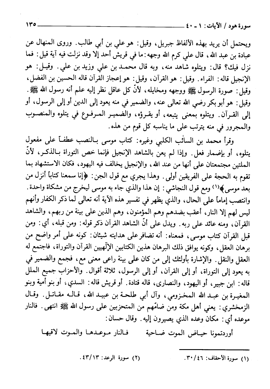 وَانْتَصَبَ إِمَامًا عَلَى الْحَالِ، وَالَّذِي يَظْهَرُ فِي تَفْسِيرِ هَذِهِ الْآيَةِ أَنَّهُ تَعَالَى لَمَّا ذَكَرَ الْكُفَّارَ وَأَنَّهُمْ لَيْسَ لَهُمْ إِلَّا النَّارُ، أَعْقَبَ بِضِدِّهِمْ وَهُمُ الْمُؤْمِنُونَ، وَهُمُ الَّذِينَ عَلَى بَيِّنَةٍ مِنْ رَبِّهِمْ، وَالشَّاهِدُ الْقُرْآنُ، وَمِنْهُ عَائِدٌ عَلَى رَبِّهِ. وَيَدُلُّ عَلَى أَنَّ الشَّاهِدَ الْقُرْآنُ ذِكْرُ قَوْلِهِ: وَمِنْ قَبْلِهِ، أَيْ: وَمِنْ قَبْلِ الْقُرْآنِ كِتَابُ موسى، فمعناه: أنه تضافر عَلَى هِدَايَتِهِ شَيْئَانِ: كَوْنُهُ عَلَى أَمْرٍ وَاضِحٍ مِنْ بُرْهَانِ الْعَقْلِ، وَكَوْنُهُ يُوَافِقُ ذَلِكَ الْبُرْهَانُ هَذَيْنِ الْكِتَابَيْنِ الْإِلَهِيَّيْنِ الْقُرْآنَ وَالتَّوْرَاةَ، فَاجْتَمَعَ لَهُ الْعَقْلُ وَالنَّقْلُ. وَالْإِشَارَةُ بِأُولَئِكَ إِلَى مَنْ كَانَ عَلَى بَيِّنَةٍ رَاعَى مَعْنَى مَعَ، فَجَمَعَ وَالضَّمِيرُ فِي بِهِ يَعُودُ إِلَى التَّوْرَاةِ، أَوْ إِلَى الْقُرْآنِ، أَوْ إِلَى الرَّسُولِ، ثَلَاثَةُ أَقْوَالٍ. وَالْأَحْزَابُ جَمِيعُ الْمِلَلِ قَالَهُ: ابْنُ جُبَيْرٍ، أَوْ الْيَهُودِ، وَالنَّصَارَى، قَالَهُ قَتَادَةُ. أَوْ قُرَيْشٌ قَالَهُ: السُّدِّيُّ، أَوْ بَنُو أُمَيَّةَ وَبَنُو الْمُغِيرَةِ بن عبد الله المخزومي، وَآلُ أَبِي طَلْحَةَ بْنَ عُبَيْدِ اللَّهِ، قَالَهُ مُقَاتِلٌ. وَقَالَ الزَّمَخْشَرِيُّ: يَعْنِي أَهْلَ مَكَّةَ وَمَنْ ضَامَّهُمْ مِنَ الْمُتَحَزِّبِينَ عَلَى رَسُولِ اللَّهِ صَلَّى اللَّهُ عَلَيْهِ وَسَلَّمَ انْتَهَى. فَالنَّارُ مَوْعِدُهُ أَيْ: مَكَانُ وَعْدِهِ الَّذِي يَصِيرُونَ إِلَيْهِ. وَقَالَ حَسَّانُ: