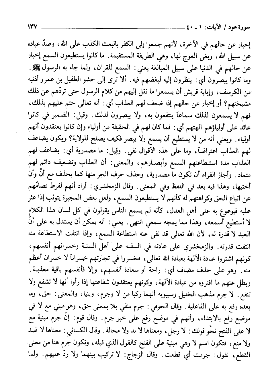 إِخْبَارٌ عَنْ حَالِهِمْ فِي الْآخِرَةِ، لِأَنَّهُمْ جَمَعُوا إِلَى الْكُفْرِ بِالْبَعْثِ الْكَذِبَ عَلَى اللَّهِ، وَصَدَّ عِبَادِهِ عَنْ سَبِيلِ اللَّهِ، وَبَغْيَ الْعِوَجِ لَهَا، وَهِيَ الطَّرِيقَةُ الْمُسْتَقِيمَةُ. مَا كَانُوا يَسْتَطِيعُونَ السَّمْعَ إِخْبَارٌ عَنْ حَالِهِمْ فِي الدُّنْيَا عَلَى سَبِيلِ الْمُبَالَغَةِ يَعْنِي: السَّمْعَ لِلْقُرْآنِ، وَلِمَا جَاءَ بِهِ الرَّسُولُ صَلَّى اللَّهُ عَلَيْهِ وَسَلَّمَ.