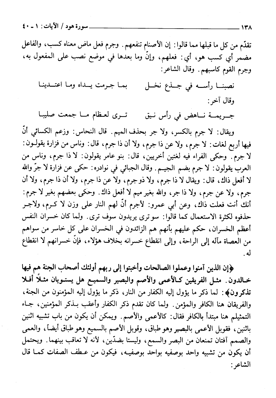 إِنَّ الَّذِينَ آمَنُوا وَعَمِلُوا الصَّالِحاتِ وَأَخْبَتُوا إِلى رَبِّهِمْ أُولئِكَ أَصْحابُ الْجَنَّةِ هُمْ فِيها خالِدُونَ. مَثَلُ الْفَرِيقَيْنِ كَالْأَعْمى وَالْأَصَمِّ وَالْبَصِيرِ وَالسَّمِيعِ هَلْ يَسْتَوِيانِ مَثَلًا أَفَلا تَذَكَّرُونَ: لَمَّا ذَكَرَ ما يؤول إِلَيْهِ الْكُفَّارُ مِنَ النَّارِ، ذكر ما يؤول إِلَيْهِ الْمُؤْمِنُونَ مِنَ الْجَنَّةِ، وَالْفَرِيقَانِ هُنَا الْكَافِرُ وَالْمُؤْمِنُ. وَلَمَّا كَانَ تَقَدَّمَ ذِكْرُ الْكُفَّارِ وَأُعْقِبَ بِذِكْرِ الْمُؤْمِنِينَ، جَاءَ التَّمْثِيلُ هُنَا مُبْتَدَأً بِالْكَافِرِ فَقَالَ: كَالْأَعْمَى وَالْأَصَمِّ. وَيُمْكِنُ أَنْ يَكُونَ مِنْ بَابِ تَشْبِيهِ اثْنَيْنِ بِاثْنَيْنِ، فَقُوبِلَ الْأَعْمَى بِالْبَصِيرِ وَهُوَ طِبَاقٌ، وَقُوبِلَ الْأَصَمُّ بِالسَّمِيعِ وَهُوَ طِبَاقٌ أَيْضًا، وَالْعَمَى وَالصَّمَمُ آفَتَانِ تَمْنَعَانِ مِنَ الْبَصَرِ وَالسَّمْعِ، وَلَيْسَتَا بِضِدَّيْنِ، لِأَنَّهُ لَا تَعَاقُبَ بَيْنَهُمَا. ويحتمل أن يكون من تَشْبِيهٍ وَاحِدٍ بِوَصْفَيْهِ بِوَاحِدٍ بِوَصْفَيْهِ، فَيَكُونُ مِنْ عَطْفِ الصِّفَاتِ كَمَا قَالَ الشَّاعِرُ: