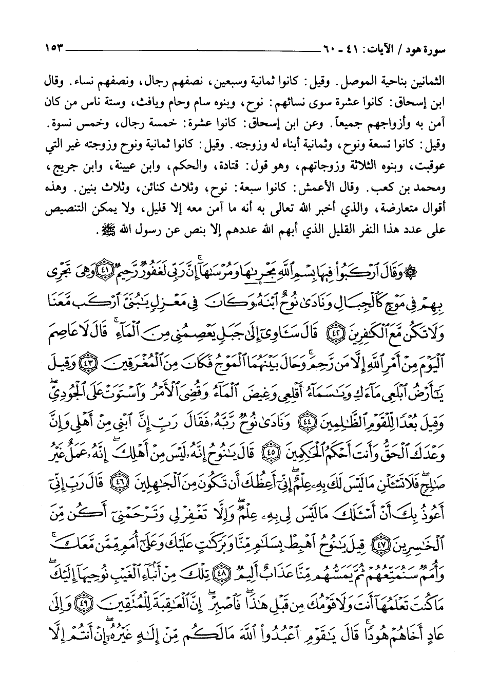 وَقالَ ارْكَبُوا فِيها بِسْمِ اللَّهِ مَجْراها وَمُرْساها إِنَّ رَبِّي لَغَفُورٌ رَحِيمٌ (41) وَهِيَ تَجْرِي بِهِمْ فِي مَوْجٍ كَالْجِبالِ وَنادى نُوحٌ ابْنَهُ وَكانَ فِي مَعْزِلٍ يَا بُنَيَّ ارْكَبْ مَعَنا وَلا تَكُنْ مَعَ الْكافِرِينَ (42) قالَ سَآوِي إِلى جَبَلٍ يَعْصِمُنِي مِنَ الْماءِ قالَ لَا عاصِمَ الْيَوْمَ مِنْ أَمْرِ اللَّهِ إِلاَّ مَنْ رَحِمَ وَحالَ بَيْنَهُمَا الْمَوْجُ فَكانَ مِنَ الْمُغْرَقِينَ (43) وَقِيلَ يَا أَرْضُ ابْلَعِي ماءَكِ وَيا سَماءُ أَقْلِعِي وَغِيضَ الْماءُ وَقُضِيَ الْأَمْرُ وَاسْتَوَتْ عَلَى الْجُودِيِّ وَقِيلَ بُعْداً لِلْقَوْمِ الظَّالِمِينَ (44) وَنادى نُوحٌ رَبَّهُ فَقالَ رَبِّ إِنَّ ابْنِي مِنْ أَهْلِي وَإِنَّ وَعْدَكَ الْحَقُّ وَأَنْتَ أَحْكَمُ الْحاكِمِينَ (45)