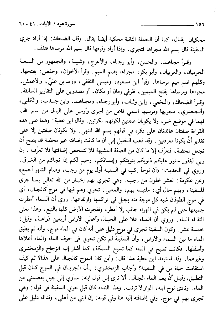 وَقَرَأَ الضَّحَّاكُ، وَالنَّخَعِيُّ، وَابْنُ وَثَّابٍ، وَأَبُو رَجَاءٍ، وَمُجَاهِدٌ، وَابْنُ جُنْدَبٍ، وَالْكَلْبِيُّ، وَالْجَحْدَرِيُّ، مُجْرِيهَا وَمُرْسِيهَا اسْمَيْ فَاعِلٍ مِنْ أَجْرَى وَأَرْسَى عَلَى الْبَدَلِ مِنَ اسْمِ اللَّهِ، فَهُمَا فِي مَوْضِعِ خَبَرٍ، وَلَا يَكُونَانِ صِفَتَيْنِ لِكَوْنِهِمَا نَكِرَتَيْنِ. وَقَالَ ابْنُ عَطِيَّةَ: وَهُمَا عَلَى هَذِهِ الْقِرَاءَةِ صِفَتَانِ عَائِدَتَانِ عَلَى ذِكْرِهِ فِي قَوْلِهِمْ بسم اللَّهِ انْتَهَى. وَلَا يَكُونَانِ صِفَتَيْنِ إِلَّا عَلَى تَقْدِيرِ أَنْ يَكُونَا مَعْرِفَتَيْنِ. وَقَدْ ذَهَبَ الْخَلِيلُ إِلَى أَنَّ مَا كَانَتْ إِضَافَتُهُ غَيْرُ مَحْضَةٍ قَدْ يَصِحُّ أَنْ تُجْعَلَ مَحْضَةً، فَتُعَرَّفَ إِلَّا مَا كَانَ مِنْ الصِّفَةِ الْمُشَبَّهَةِ فَلَا تَتَمَحَّضُ إِضَافَتُهَا فَلَا تُعَرَّفُ. إِنَّ رَبِّي لَغَفُورٌ سَتُورٌ عَلَيْكُمْ ذُنُوبَكُمْ بِتَوْبَتِكُمْ وَإِيمَانِكُمْ، رَحِيمٌ لَكُمْ إِذَا نَجَّاكُمْ مِنَ الْغَرَقِ.