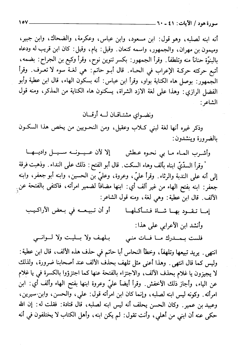 أَنَّهُ ابْنُهُ لِصُلْبِهِ، وَهُوَ قَوْلُ: ابْنِ مَسْعُودٍ، وابن عَبَّاسٍ، وَعِكْرِمَةَ، وَالضَّحَّاكِ، وَابْنِ جُبَيْرٍ، وَمَيْمُونِ بْنِ مِهْرَانَ، وَالْجُمْهُورِ، وَاسْمُهُ كَنْعَانُ. وَقِيلَ: يَامُ، وَقِيلَ: كَانَ ابْنَ قريب له ودعاه بالنبوّة حَنَانًا مِنْهُ وَتَلَطُّفًا. وَقَرَأَ الْجُمْهُورُ: بِكَسْرِ تَنْوِينِ نُوحٍ، وَقَرَأَ وَكِيعُ بْنُ الْجَرَّاحِ: بِضَمِّهِ، أَتْبَعَ حَرَكَتَهُ حَرَكَةَ الْإِعْرَابِ فِي الْحَاءِ. قَالَ أَبُو حَاتِمٍ: هِيَ لُغَةُ سُوءٍ لَا تُعْرَفُ. وَقَرَأَ الْجُمْهُورُ: بِوَصْلِ هَاءِ الْكِنَايَةِ بِوَاوٍ، وَقَرَأَ ابْنُ عَبَّاسٍ: إِنَّهُ بِسُكُونِ الْهَاءِ، قَالَ ابْنُ عَطِيَّةَ وَأَبُو الْفَضْلِ الرَّازِيُّ: وَهَذَا عَلَى لُغَةِ الْأَزْدِ الشُّرَاةِ، يُسَكِّنُونَ هَاءَ الْكِنَايَةِ مِنَ الْمُذَكَّرِ، وَمِنْهُ قول الشاعر: