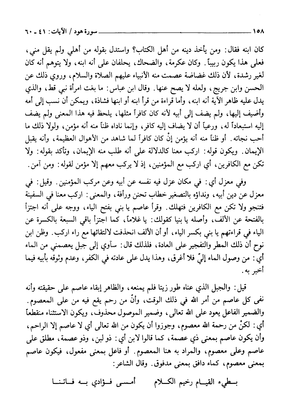 كَانَ ابْنَهُ فَقَالَ: وَمَنْ يَأْخُذُ دِينِهِ مِنْ أَهْلِ الْكِتَابِ؟ وَاسْتَدَلَّ بِقَوْلِهِ مِنْ أَهْلِي وَلَمْ يَقُلْ مِنِّي، فَعَلَى هَذَا يَكُونُ رَبِيبًا. وَكَانَ عِكْرِمَةُ، وَالضَّحَّاكُ، يَحْلِفَانِ عَلَى أَنَّهُ ابْنُهُ، وَلَا يُتَوَهَّمُ أَنَّهُ كَانَ لِغَيْرِ رِشْدَةٍ، لِأَنَّ ذَلِكَ غَضَاضَةٌ عُصِمَتْ مِنْهُ الْأَنْبِيَاءُ عَلَيْهِمُ الصَّلَاةُ وَالسَّلَامُ، وَرُوِيَ ذَلِكَ عَنِ الْحَسَنِ وَابْنِ جُرَيْجٍ، ولعله لا يصح عَنْهَا. وَقَالَ ابْنُ عَبَّاسٍ: مَا بَغَتِ امْرَأَةُ نَبِيٍّ قَطُّ، وَالَّذِي يَدُلُّ عَلَيْهِ ظَاهِرُ الْآيَةِ أَنَّهُ ابْنُهُ، وَأَمَّا قِرَاءَةُ مَنْ قَرَأَ ابْنَهُ أَوِ ابْنَهَا فَشَاذَّةٌ، وَيُمْكِنُ أَنْ نُسِبَ إِلَى أُمِّهِ وَأُضِيفَ إِلَيْهَا، وَلَمْ يُضَفْ إِلَى أَبِيهِ لِأَنَّهُ كَانَ كَافِرًا مِثْلَهَا، يُلْحَظُ فِيهِ هَذَا الْمَعْنَى وَلَمْ يُضَفْ إِلَيْهِ اسْتِبْعَادًا لَهُ، وَرَعْيًا أَنْ لَا يُضَافَ إِلَيْهِ كَافِرٌ، وَإِنَّمَا نَادَاهُ ظَنًّا مِنْهُ أَنَّهُ مُؤْمِنٌ، وَلَوْلَا ذَلِكَ مَا أَحَبَّ نَجَاتَهُ. أَوْ ظَنًّا مِنْهُ أَنَّهُ يُؤْمِنُ إِنْ كَانَ كَافِرًا لِمَا شَاهَدَ مِنَ الْأَهْوَالِ الْعَظِيمَةِ، وَأَنَّهُ يَقْبَلُ الْإِيمَانَ. وَيَكُونُ قَوْلُهُ: ارْكَبْ مَعَنَا كَالدَّلَالَةِ عَلَى أَنَّهُ طَلَبَ مِنْهُ الْإِيمَانَ، وَتَأَكَّدَ بِقَوْلِهِ: وَلَا تَكُنْ مَعَ الْكَافِرِينَ، أَيِ ارْكَبْ مَعَ الْمُؤْمِنِينَ، إِذْ لَا يَرْكَبُ مَعَهُمْ إِلَّا مُؤْمِنٌ لِقَوْلِهِ: ومن آمن.