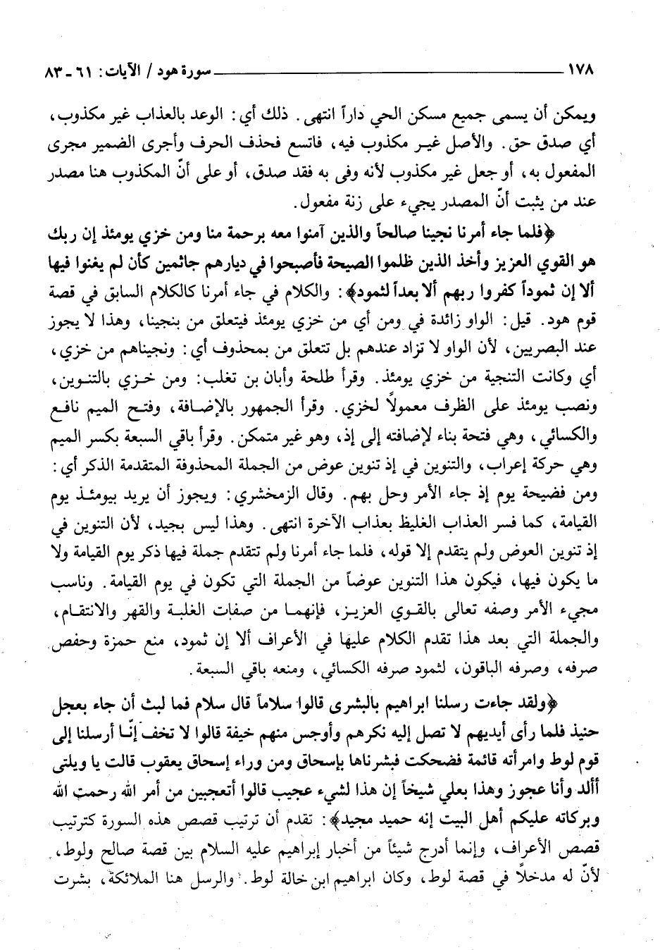 وَلَقَدْ جاءَتْ رُسُلُنا إِبْراهِيمَ بِالْبُشْرى قالُوا سَلاماً قالَ سَلامٌ فَما لَبِثَ أَنْ جاءَ بِعِجْلٍ حَنِيذٍ فَلَمَّا رَأى أَيْدِيَهُمْ لَا تَصِلُ إِلَيْهِ نَكِرَهُمْ وَأَوْجَسَ مِنْهُمْ خِيفَةً قالُوا لَا تَخَفْ إِنَّا أُرْسِلْنا إِلى قَوْمِ لُوطٍ وَامْرَأَتُهُ قائِمَةٌ فَضَحِكَتْ فَبَشَّرْناها بِإِسْحاقَ وَمِنْ وَراءِ إِسْحاقَ يَعْقُوبَ قالَتْ يَا وَيْلَتى أَأَلِدُ وَأَنَا عَجُوزٌ وَهذا بَعْلِي شَيْخاً إِنَّ هَذَا لَشَيْءٌ عَجِيبٌ قالُوا أَتَعْجَبِينَ مِنْ أَمْرِ اللَّهِ رَحْمَتُ اللَّهِ وَبَرَكاتُهُ عَلَيْكُمْ أَهْلَ الْبَيْتِ إِنَّهُ حَمِيدٌ مَجِيدٌ: تَقَدَّمَ أَنَّ تَرْتِيبَ قَصَصِ هَذِهِ السُّورَةِ كَتَرْتِيبِ قَصَصِ الْأَعْرَافِ، وَإِنَّمَا أَدْرَجَ شَيْئًا مِنْ أَخْبَارِ إِبْرَاهِيمَ عَلَيْهِ السَّلَامُ بَيْنَ قِصَّةِ صَالِحٍ وَلُوطٍ، لِأَنَّ لَهُ مَدْخَلًا فِي قِصَّةِ لُوطٍ، وَكَانَ إِبْرَاهِيمُ ابْنَ خَالَةِ لُوطٍ. وَالرُّسُلُ هُنَا الْمَلَائِكَةُ، بَشَّرَتْ