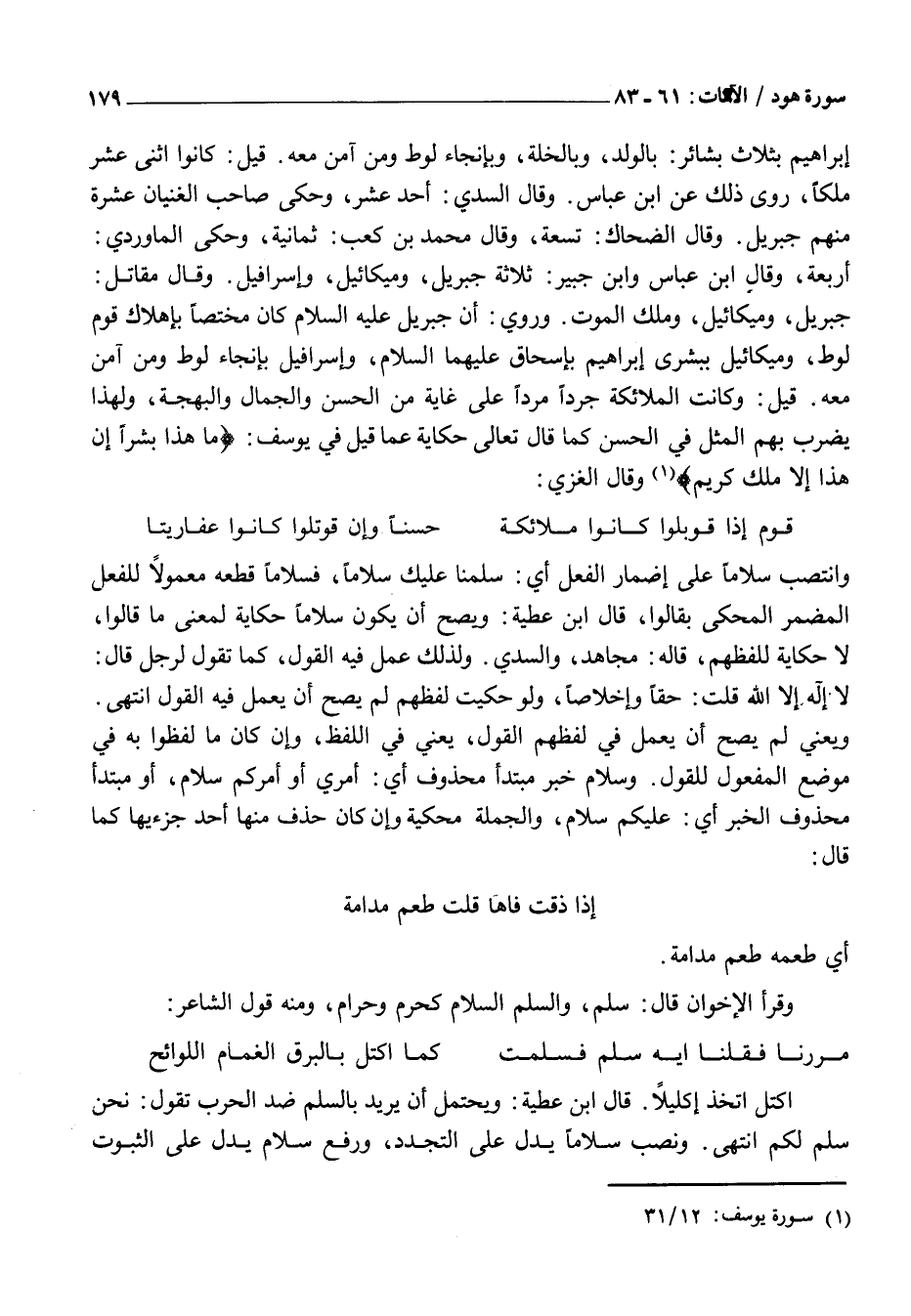 اكْتَلَّ اتَّخَذَ إِكْلِيلًا. قَالَ ابْنُ عَطِيَّةَ: وَيُحْتَمَلُ أَنْ يُرِيدَ بِالسِّلْمِ ضِدَّ الْحَرْبِ تَقُولُ: نَحْنُ سِلْمٌ لَكُمْ انْتَهَى. وَنَصْبُ سَلَامًا يَدُلُّ عَلَى التَّجَدُّدِ، وَرَفْعُ سَلَامٌ يَدُلُّ على الثبوت