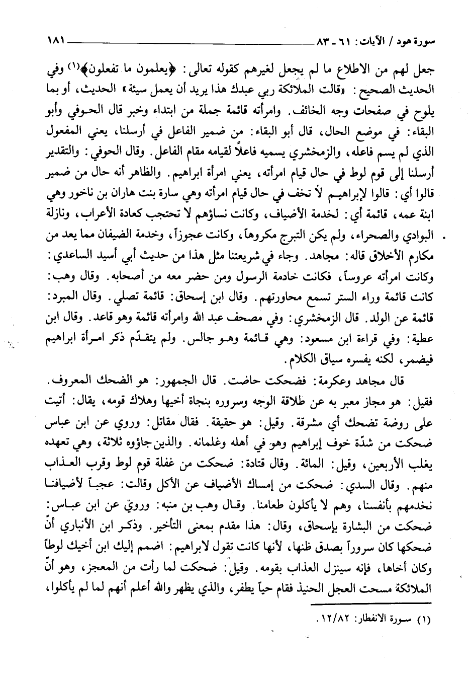 ضحكت من الْبِشَارَةِ بِإِسْحَاقَ، وَقَالَ: هَذَا مُقَدَّمٌ بِمَعْنَى التَّأْخِيرِ. وَذَكَرَ ابْنُ الْأَنْبَارِيِّ أَنَّ ضَحِكَهَا كَانَ سُرُورًا بِصِدْقِ ظَنِّهَا، لِأَنَّهَا كَانَتْ تَقُولُ لِإِبْرَاهِيمَ: اضْمُمْ إِلَيْكَ ابْنَ أَخِيكَ لُوطًا وَكَانَ أَخَاهَا، فَإِنَّهُ سَيَنْزِلُ الْعَذَابُ بِقَوْمِهِ. وَقِيلَ: ضَحِكَتْ لِمَا رَأَتْ مِنَ الْمُعْجِزِ، وَهُوَ أَنَّ الْمَلَائِكَةَ مَسَحَتِ الْعِجْلَ الْحَنِيذَ فَقَامَ حَيًّا يَطْفِرُ، وَالَّذِي يَظْهَرُ وَاللَّهُ أَعْلَمُ أَنَّهُمْ لَمَّا لم يأكلوا،