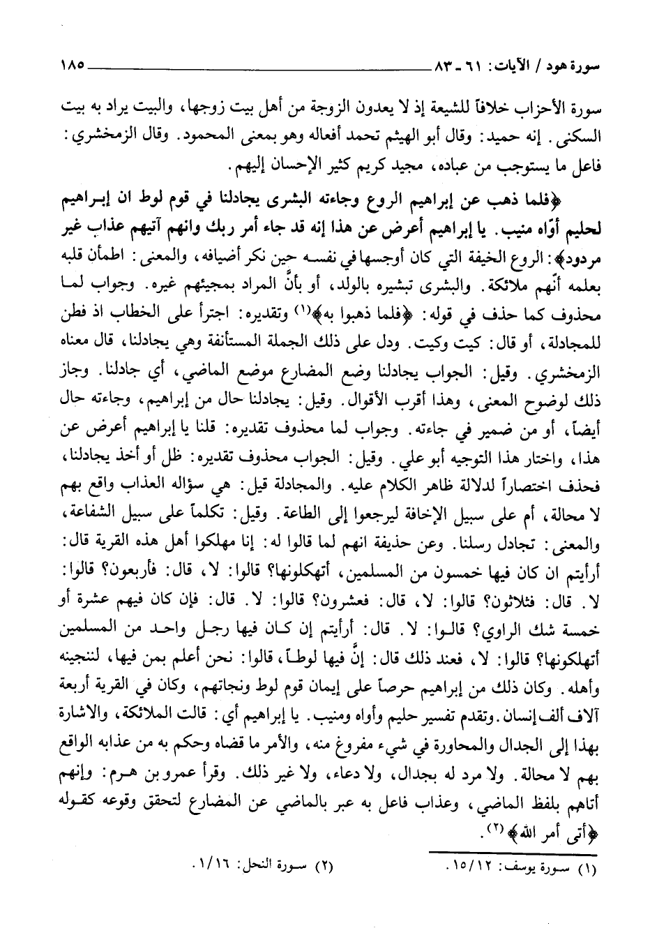 سُورَةِ الْأَحْزَابِ خِلَافًا لِلشِّيعَةِ إِذْ لَا يَعُدُّونَ الزَّوْجَةَ مِنْ أَهْلِ بَيْتِ زَوْجِهَا، وَالْبَيْتُ يُرَادُ بِهِ بَيْتُ السُّكْنَى. إِنَّهُ حَمِيدٌ: وَقَالَ أَبُو الْهَيْثَمِ تُحْمَدُ أَفْعَالُهُ وَهُوَ بِمَعْنَى الْمَحْمُودِ. وَقَالَ الزَّمَخْشَرِيُّ: