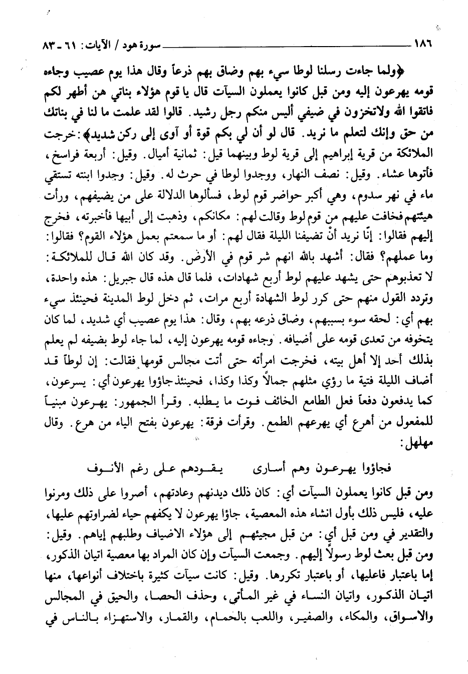 لَا تُعَذِّبُوهُمْ حَتَّى يَشْهَدَ عَلَيْهِمْ لُوطٌ أَرْبَعَ شَهَادَاتٍ، فَلَمَّا قَالَ هَذِهِ قَالَ جِبْرِيلُ: هَذِهِ وَاحِدَةٌ، وَتَرَدَّدَ الْقَوْلُ مِنْهُمْ حَتَّى كَرَّرَ لُوطٌ الشَّهَادَةَ أَرْبَعَ مَرَّاتٍ، ثُمَّ دَخَلَ لُوطٌ الْمَدِينَةَ فَحِينَئِذٍ سِيءَ بِهِمْ أَيْ: لَحِقَهُ سُوءٌ بِسَبَبِهِمْ، وَضَاقَ ذَرْعُهُ بِهِمْ، وَقَالَ: هَذَا يَوْمٌ عَصِيبٌ أَيْ شَدِيدٌ، لِمَا كَانَ يَتَخَوَّفُهُ مِنْ تَعَدِّي قَوْمِهِ عَلَى أَضْيَافِهِ. وَجَاءَهُ قَوْمُهُ يُهْرَعُونَ إِلَيْهِ، لَمَّا جَاءَ لُوطٌ بِضَيْفِهِ لَمْ يَعْلَمْ بِذَلِكَ أَحَدٌ إِلَّا أَهْلُ بَيْتِهِ، فَخَرَجَتِ امْرَأَتُهُ حَتَّى أَتَتْ مَجَالِسَ قَوْمِهَا فَقَالَتْ: إِنَّ لُوطًا قَدْ أَضَافَ اللَّيْلَةَ فَتْيَةً مَا رؤي مِثْلُهُمْ جَمَالًا وَكَذَا وَكَذَا، فحينئذ جاؤوا يُهْرَعُونَ أَيْ: يُسْرِعُونَ، كَمَا يَدْفَعُونَ دَفْعًا فِعْلَ الطَّامِعِ الْخَائِفِ فَوْتَ مَا يَطْلُبُهُ.