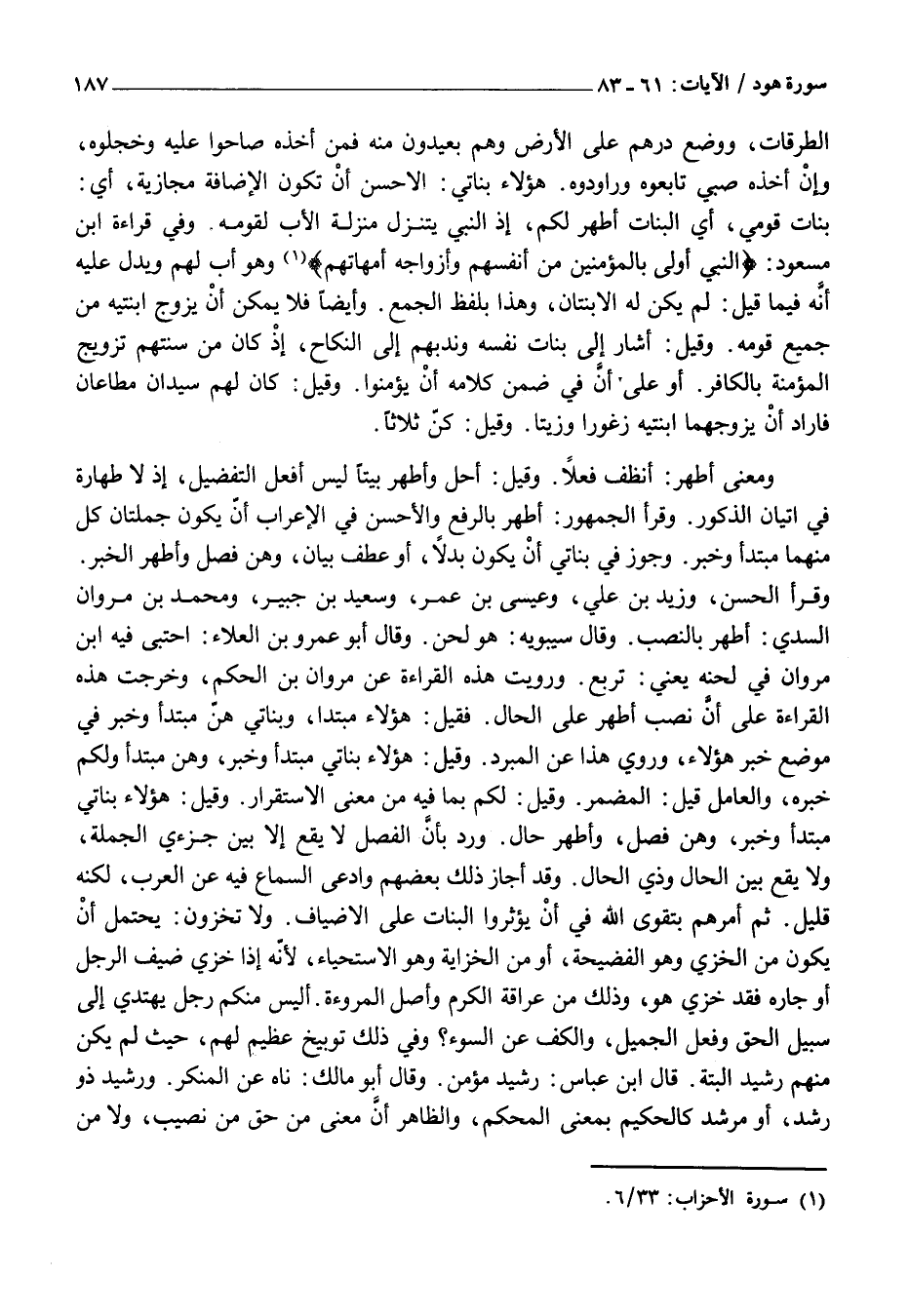 وَقَرَأَ الْحَسَنُ، وَزَيْدُ بْنُ عَلِيٍّ، وَعِيسَى بْنُ عُمَرَ، وَسَعِيدُ بْنُ جُبَيْرٍ، وَمُحَمَّدُ بْنُ مَرْوَانَ السُّدِّيُّ: أَطْهَرَ بِالنَّصْبِ. وَقَالَ سِيبَوَيْهِ: هُوَ لَحْنٌ. وَقَالَ أَبُو عَمْرِو بْنُ الْعَلَاءِ: احْتَبَى فِيهِ ابْنُ مَرْوَانَ فِي لَحْنِهِ يَعْنِي: تَرَبَّعَ. وَرُوِيَتْ هَذِهِ الْقِرَاءَةُ عَنْ مَرْوَانَ بْنِ الْحَكَمِ، وَخُرِّجَتْ هَذِهِ الْقِرَاءَةُ عَلَى أَنَّ نَصْبَ أَطْهَرَ عَلَى الْحَالِ. فَقِيلَ: هؤلاء مبتدا، وبناتي هُنَّ مُبْتَدَأٍ وَخَبَرٍ فِي مَوْضِعِ خَبَرِ هَؤُلَاءِ، وَرُوِيَ هَذَا عَنِ الْمُبَرِّدِ. وَقِيلَ: هَؤُلَاءِ بَنَاتِي مُبْتَدَأٌ وَخَبَرٌ، وهن مبتدأ ولكم خَبَرُهُ، وَالْعَامِلُ قِيلَ: الْمُضْمَرُ. وَقِيلَ: لَكُمْ بِمَا فِيهِ مِنْ مَعْنَى الِاسْتِقْرَارِ. وَقِيلَ: هَؤُلَاءِ بَنَاتِي مُبْتَدَأٌ وَخَبَرٌ، وهن فصل، وأطهر حَالٌ. وَرُدَّ بِأَنَّ الْفَصْلَ لَا يَقَعُ إِلَّا بَيْنَ جزءي الْجُمْلَةِ، وَلَا يَقَعُ بَيْنَ الْحَالِ وَذِي الْحَالِ. وَقَدْ أَجَازَ ذَلِكَ بَعْضُهُمْ وَادَّعَى السَّمَاعَ فِيهِ عَنِ الْعَرَبِ، لَكِنَّهُ قَلِيلٌ. ثُمَّ أَمَرَهُمْ بِتَقْوَى اللَّهِ فِي أَنْ يُؤْثِرُوا الْبَنَاتِ عَلَى الْأَضْيَافِ. ولا تخزون: يُحْتَمَلُ أَنْ يَكُونَ مِنْ الْخِزْيِ وَهُوَ الْفَضِيحَةُ، أَوْ مِنَ الْخَزَايَةِ وَهُوَ الِاسْتِحْيَاءُ، لِأَنَّهُ إِذَا خُزِيَ ضَيْفُ الرَّجُلِ أَوْ جَارُهُ فَقَدْ خُزِيَ هُوَ، وَذَلِكَ مِنْ عَرَاقَةِ الْكَرَمِ وَأَصْلِ الْمُرُوءَةَ. أَلَيْسَ مِنْكُمْ رَجُلٌ يَهْتَدِي إِلَى سَبِيلِ الْحَقِّ وَفِعْلِ الْجَمِيلِ، وَالْكَفِّ عَنِ السُّوءِ؟ وَفِي ذَلِكَ تَوْبِيخٌ عَظِيمٌ لَهُمْ، حَيْثُ لَمْ يَكُنْ مِنْهُمْ رَشِيدٌ الْبَتَّةَ. قَالَ ابْنُ عَبَّاسٍ: رَشِيدٌ مُؤْمِنٌ. وَقَالَ أَبُو مَالِكٍ: نَاهٍ عَنِ الْمُنْكَرِ. وَرَشِيدٌ ذُو رُشْدٍ، أَوْ مُرْشِدٌ كَالْحَكِيمِ بِمَعْنَى الْمُحْكَمُ، وَالظَّاهِرُ أَنَّ مَعْنَى مِنْ حَقٍّ مِنْ نصيب، ولا من