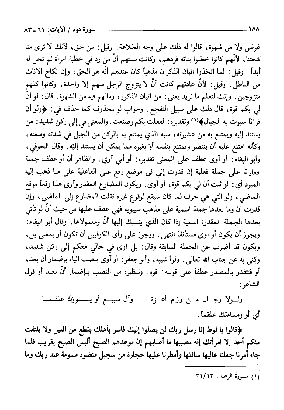 غَرَضٍ وَلَا مِنْ شَهْوَةٍ، قَالُوا لَهُ ذَلِكَ عَلَى وَجْهِ الْخَلَاعَةِ. وَقِيلَ: مِنْ حَقٍّ، لِأَنَّكَ لَا تَرَى مِنَّا كُحَّتَنَا، لِأَنَّهُمْ كَانُوا خَطَبُوا بَنَاتَهُ فَرَدَّهُمْ، وَكَانَتْ سُنَّتُهُمْ أَنَّ مَنْ رُدَّ فِي خِطْبَةِ امْرَأَةٍ لَمْ تَحِلَّ لَهُ أَبَدًا. وَقِيلَ: لَمَّا اتَّخَذُوا إِتْيَانَ الذُّكْرَانِ مَذْهَبًا كَانَ عِنْدَهُمْ أَنَّهُ هُوَ الْحَقُّ، وَإِنَّ نِكَاحَ الْإِنَاثِ مِنَ الْبَاطِلِ. وَقِيلَ: لِأَنَّ عَادَتَهُمْ كَانَتْ أَنْ لَا يَتَزَوَّجَ الرَّجُلُ مِنْهُمْ إِلَّا وَاحِدَةً، وَكَانُوا كُلُّهُمْ مُتَزَوِّجِينَ. وَإِنَّكَ لَتَعْلَمُ مَا نُرِيدُ يَعْنِي: مِنْ إِتْيَانِ الذكور، وما لهم فِيهِ مِنَ الشَّهْوَةِ. قَالَ: لَوْ أَنَّ لِي بِكُمْ قُوَّةً، قَالَ ذَلِكَ عَلَى سَبِيلِ التَّفَجُّعِ. وَجَوَابُ لَوْ مَحْذُوفٌ كَمَا حُذِفَ فِي: وَلَوْ أَنَّ قُرْآناً سُيِّرَتْ بِهِ الْجِبالُ «1» وَتَقْدِيرُهُ: لَفَعَلْتُ بِكُمْ وَصَنَعْتُ. وَالْمَعْنَى فِي إِلَى رُكْنٍ شَدِيدٍ: مَنْ يَسْتَنِدُ إِلَيْهِ وَيَمْتَنِعُ بِهِ مِنْ عَشِيرَتِهِ، شَبَّهَ الَّذِي يَمْتَنِعُ بِهِ بِالرُّكْنِ مِنَ الْجَبَلِ فِي شِدَّتِهِ وَمَنَعَتِهِ، وَكَأَنَّهُ امْتَنَعَ عَلَيْهِ أَنْ يَنْتَصِرَ وَيَمْتَنِعَ بِنَفْسِهِ أَوْ بِغَيْرِهِ مِمَّا يُمْكِنُ أَنْ يَسْتَنِدَ إِلَيْهِ. وَقَالَ الْحَوْفِيُّ، وَأَبُو الْبَقَاءِ: أَوْ آوِي عَطْفٌ عَلَى الْمَعْنَى تَقْدِيرُهُ: أَوْ أَنِّي آوِي. وَالظَّاهِرُ أَنَّ أَوْ عَطَفَ جُمْلَةً فِعْلِيَّةً عَلَى جُمْلَةٍ فِعْلِيَّةٍ إِنْ قَدَّرْتَ أَنِّي فِي مَوْضِعِ رَفْعٍ عَلَى الْفَاعِلِيَّةِ عَلَى مَا ذَهَبَ إِلَيْهِ الْمُبَرِّدُ أَيْ: لَوْ ثَبَتَ أَنَّ لِي بِكُمْ قُوَّةً، أَوْ آوِي. وَيَكُونُ الْمُضَارِعُ الْمُقَدَّرُ وَآوِي هَذَا وَقَعَا مَوْقِعَ الْمَاضِي، وَلَوِ الَّتِي هِيَ حَرْفٌ لِمَا كَانَ سَيَقَعُ لِوُقُوعِ غَيْرِهِ نَقَلَتِ الْمُضَارِعَ إِلَى الْمَاضِي، وَإِنْ قَدَّرْتَ أَنَّ وَمَا بَعْدَهَا جُمْلَةً اسْمِيَّةً عَلَى مَذْهَبِ سِيبَوَيْهِ فَهِيَ عَطْفٌ عَلَيْهَا مِنْ حَيْثُ أَنَّ لَوْ تَأْتِي بَعْدَهَا الْجُمْلَةُ الْمُقَدَّرَةُ اسْمِيَّةً إِذَا كَانَ الَّذِي يَنْسَبِكُ إِلَيْهَا أَنَّ وَمَعْمُولَاهَا. وَقَالَ أَبُو الْبَقَاءِ: