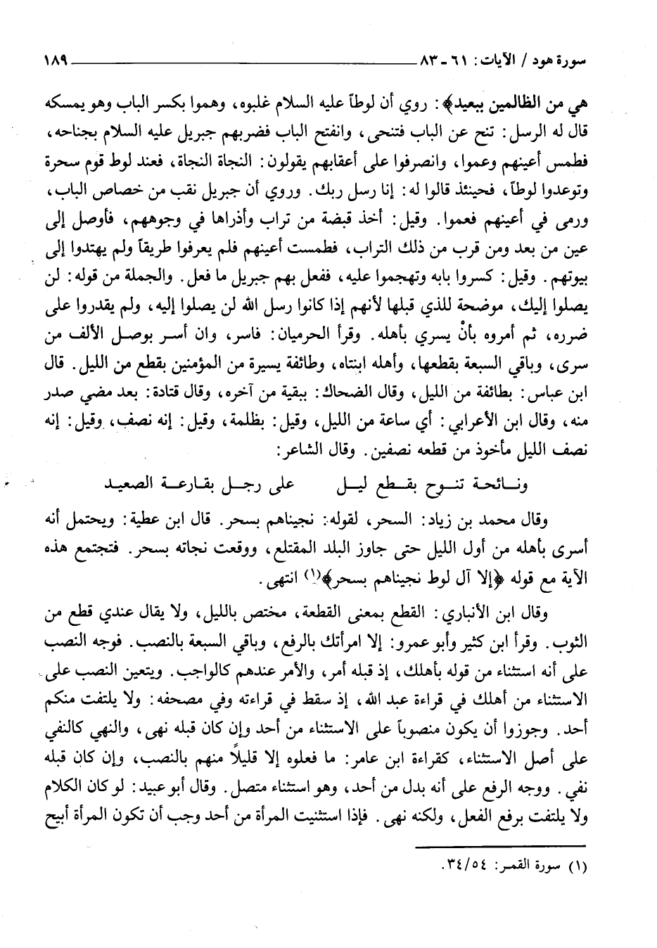 وَقَالَ ابْنُ الْأَنْبَارِيِّ: الْقِطْعُ بِمَعْنَى الْقِطْعَةُ، مُخْتَصٌّ بِاللَّيْلِ، وَلَا يُقَالُ عِنْدِي قِطْعٌ مِنَ الثَّوْبِ. وَقَرَأَ ابْنُ كَثِيرٍ وَأَبُو عَمْرٍو: إِلَّا امْرَأَتَكَ بِالرَّفْعِ، وَبَاقِي السَّبْعَةِ بِالنَّصْبِ. فَوَجْهُ النَّصْبِ عَلَى أَنَّهُ اسْتِثْنَاءٌ مِنْ قَوْلِهِ بِأَهْلِكَ، إِذْ قَبْلَهُ أَمْرٌ، وَالْأَمْرُ عِنْدَهُمْ كَالْوَاجِبِ. وَيَتَعَيَّنُ النَّصْبُ عَلَى الِاسْتِثْنَاءِ مِنْ أَهْلِكَ فِي قِرَاءَةِ عَبْدِ اللَّهِ، إِذْ سَقَطَ فِي قِرَاءَتِهِ وَفِي مُصْحَفِهِ: وَلَا يَلْتَفِتْ مِنْكُمْ أَحَدٌ. وَجَوَّزُوا أَنْ يَكُونَ مَنْصُوبًا عَلَى الِاسْتِثْنَاءِ مِنْ أَحَدٌ وَإِنْ كَانَ قَبْلَهُ نَهْيٌ، وَالنَّهْيُ كَالنَّفْيِ عَلَى أَصْلِ الِاسْتِثْنَاءِ، كَقِرَاءَةِ ابْنِ عَامِرٍ: مَا فَعَلُوهُ إِلَّا قَلِيلًا مِنْهُمْ بِالنَّصْبِ، وَإِنْ كَانَ قَبْلَهُ نَفْيٌ. وَوَجْهُ الرَّفْعِ عَلَى أَنَّهُ بَدَلٌ مِنَ أَحَدٍ، وَهُوَ اسْتِثْنَاءٌ مُتَّصِلٌ. وَقَالَ أَبُو عُبَيْدٍ: لَوْ كَانَ الْكَلَامُ وَلَا يَلْتَفِتْ بِرَفْعِ الْفِعْلِ، وَلَكِنَّهُ نَهْيٌ. فَإِذَا اسْتَثْنَيْتَ الْمَرْأَةَ مِنْ أَحَدٌ وَجَبَ أَنْ تكون المرأة أبيح
