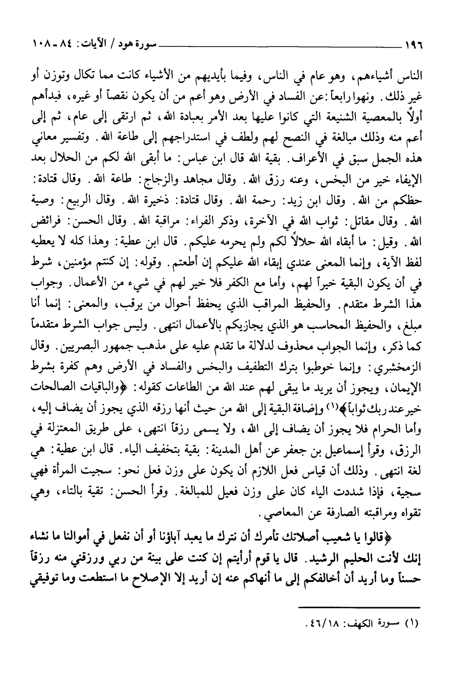 النَّاسِ أَشْيَاءَهُمْ، وَهُوَ عَامٌّ فِي النَّاسِ، وَفِيمَا بِأَيْدِيهِمْ مِنَ الْأَشْيَاءِ كَانَتْ مِمَّا تُكَالُ وَتُوزَنُ أَوْ غَيْرَ ذَلِكَ. وَنُهُوا رَابِعًا: عَنِ الْفَسَادِ فِي الْأَرْضِ وَهُوَ أَعَمُّ مِنْ أَنْ يَكُونَ نَقْصًا أَوْ غَيْرَهُ، فَبَدَأَهُمْ أَوَّلًا بِالْمَعْصِيَةِ الشَّنِيعَةِ الَّتِي كَانُوا عَلَيْهَا بَعْدَ الْأَمْرِ بِعِبَادَةِ اللَّهِ، ثُمَّ ارْتَقَى إِلَى عَامٍّ، ثُمَّ إِلَى أَعَمَّ مِنْهُ وَذَلِكَ مُبَالَغَةٌ فِي النُّصْحِ لَهُمْ وَلُطْفٌ فِي اسْتِدْرَاجِهِمْ إِلَى طَاعَةِ اللَّهِ. وَتَفْسِيرُ مَعَانِي هَذِهِ الْجُمَلِ سَبَقَ فِي الْأَعْرَافِ. بَقِيَّةُ اللَّهِ قَالَ ابْنُ عَبَّاسٍ: مَا أَبْقَى اللَّهُ لَكُمْ مِنَ الْحَلَالِ بَعْدَ الْإِيفَاءِ خَيْرٌ مِنَ الْبَخْسِ، وَعَنْهُ رِزْقُ اللَّهِ. وَقَالَ مُجَاهِدٌ وَالزَّجَّاجُ: طَاعَةُ اللَّهِ. وَقَالَ قَتَادَةُ: