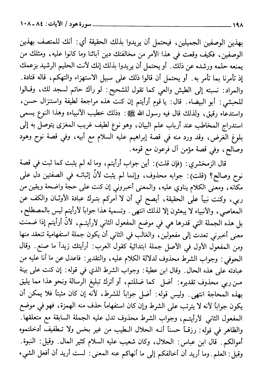قَالَ الزَّمَخْشَرِيُّ: (فَإِنْ قُلْتَ) : أَيْنَ جَوَابُ أَرَأَيْتُمْ، وما له لَمْ يَثْبُتْ كَمَا ثَبَتَ فِي قِصَّةِ نُوحٍ وَصَالِحٍ؟ (قُلْتُ) : جَوَابُهُ مَحْذُوفٌ، وَإِنَّمَا لَمْ يَثْبُتْ لِأَنَّ إِثْبَاتَهُ فِي الصِّفَتَيْنِ دَلَّ عَلَى مَكَانِهِ، وَمَعْنَى الْكَلَامِ يُنَاوِي عَلَيْهِ، وَالْمَعْنَى أَخْبِرُونِي إِنْ كُنْتُ عَلَى حُجَّةٍ وَاضِحَةٍ وَيَقِينٍ مِنْ رَبِّي، وَكُنْتُ نَبِيًّا عَلَى الْحَقِيقَةِ، أَيَصِحُّ لِي أَنْ لَا آمُرَكُمْ بِتَرْكِ عِبَادَةِ الْأَوْثَانِ وَالْكَفِّ عَنِ الْمَعَاصِي، وَالْأَنْبِيَاءُ لَا يُبْعَثُونَ إِلَّا لِذَلِكَ انْتَهَى. وَتَسْمِيَةُ هَذَا جَوَابًا لِأَرَأَيْتُمْ لَيْسَ بِالْمُصْطَلَحِ، بَلْ هَذِهِ الْجُمْلَةُ الَّتِي قَدَّرَهَا هِيَ فِي مَوْضِعِ الْمَفْعُولِ الثَّانِي لِأَرَأَيْتُمْ، لِأَنَّ أَرَأَيْتُمْ إِذَا ضُمِّنَتْ مَعْنَى أَخْبِرْنِي تَعَدَّتْ إِلَى مَفْعُولَيْنِ، وَالْغَالِبُ فِي الثَّانِي أَنْ يَكُونَ جُمْلَةً اسْتِفْهَامِيَّةً تَنْعَقِدُ مِنْهَا وَمِنَ الْمَفْعُولِ الْأَوَّلِ فِي الْأَصْلِ جُمْلَةٌ ابْتِدَائِيَّةٌ كَقَوْلِ الْعَرَبِ: أرأيتك زيدا ما صنع. وَقَالَ الْحَوْفِيُّ: وَجَوَابُ الشَّرْطِ مَحْذُوفٌ لِدَلَالَةِ الكلام عليه، وَالتَّقْدِيرُ: فَأَعْدِلْ عَنْ مَا أَنَا عَلَيْهِ مِنْ عِبَادَتِهِ عَلَى هَذِهِ الْحَالِ. وَقَالَ ابْنُ عَطِيَّةَ: وَجَوَابُ الشَّرْطِ الَّذِي فِي قَوْلِهِ: إِنْ كُنْتُ عَلَى بَيِّنَةٍ مِنْ رَبِّي مَحْذُوفٌ تَقْدِيرُهُ: أَضِلُّ كَمَا ضَلَلْتُمْ، أَوْ أَتْرُكُ تَبْلِيغَ الرِّسَالَةِ وَنَحْوَ هَذَا مِمَّا يَلِيقُ بِهَذِهِ الْمُحَاجَّةِ انْتَهَى. وَلَيْسَ قَوْلُهُ: أَضِلُّ جَوَابًا لِلشَّرْطِ، لِأَنَّهُ إِنْ كَانَ مُثْبَتًا فَلَا يُمْكِنُ أَنْ يَكُونَ جَوَابًا لِأَنَّهُ لَا يَتَرَتَّبُ عَلَى الشَّرْطِ وَإِنْ كَانَ اسْتِفْهَامًا حُذِفَ مِنْهُ الْهَمْزَةِ، فَهُوَ فِي مَوْضِعِ الْمَفْعُولِ الثَّانِي لِأَرَأَيْتُمْ، وَجَوَابُ الشَّرْطِ مَحْذُوفٌ تَدُلُّ عَلَيْهِ الْجُمْلَةُ السَّابِقَةُ مَعَ مُتَعَلِّقِهَا.