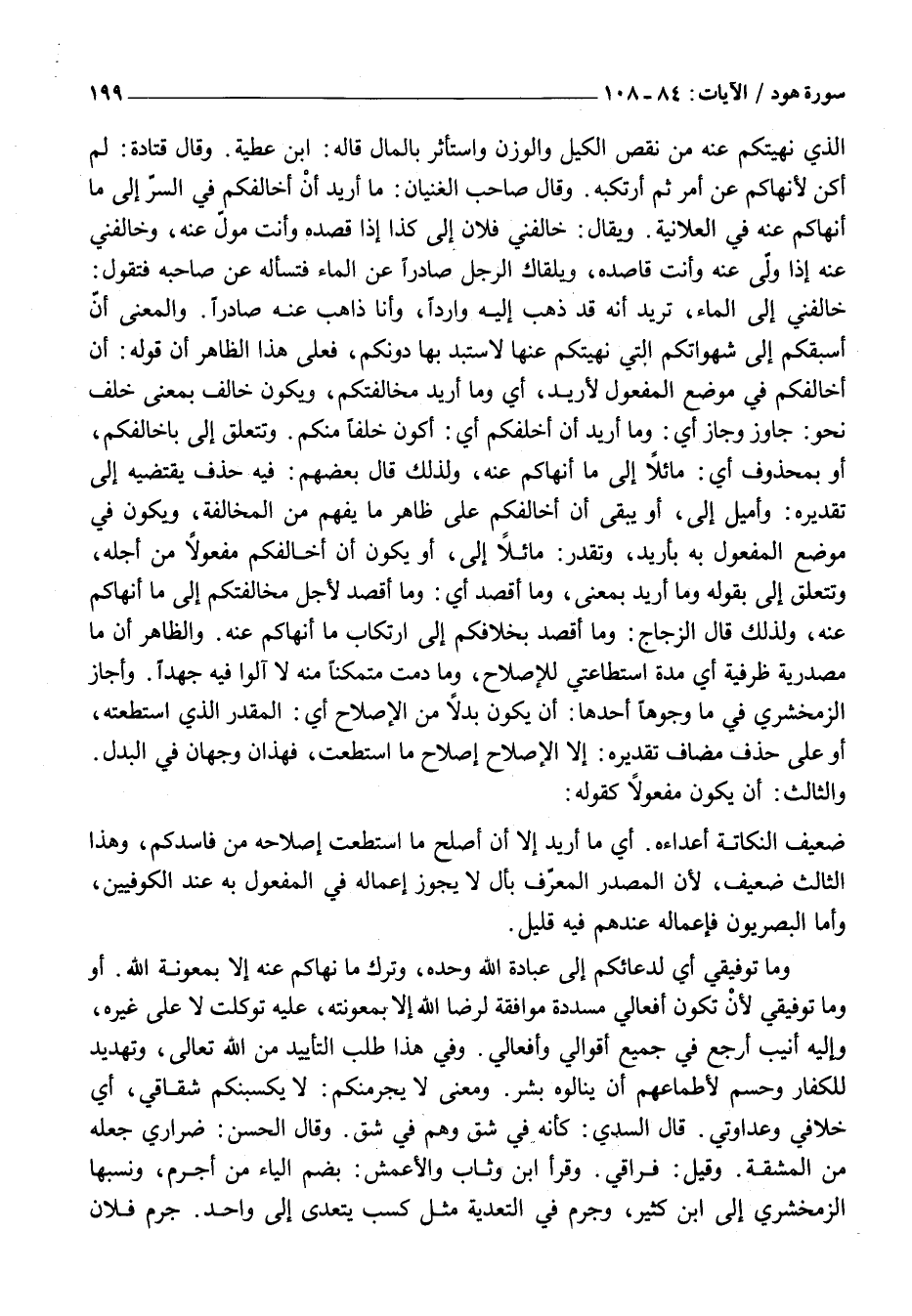 خَالَفَنِي إِلَى الْمَاءِ، تُرِيدُ أَنَّهُ قَدْ ذَهَبَ إِلَيْهِ وَارِدًا، وَأَنَا ذَاهِبٌ عَنْهُ صَادِرًا. وَالْمَعْنَى أَنْ أَسْبِقَكُمْ إِلَى شَهَوَاتِكُمُ الَّتِي نَهَيْتُكُمْ عَنْهَا لَأَسْتَبِدَّ بِهَا دُونَكُمْ، فَعَلَى هَذَا الظَّاهِرُ أَنَّ قَوْلَهُ: أَنْ أُخَالِفَكُمْ فِي مَوْضِعِ الْمَفْعُولِ لِأُرِيدُ، أَيْ وَمَا أُرِيدُ مُخَالَفَتَكُمْ، وَيَكُونُ خَالَفَ بِمَعْنَى خَلَفَ نَحْوَ: جَاوَزَ وَجَازَ أَيْ: وَمَا أُرِيدُ أَنْ أَخْلُفَكُمْ أَيْ: أَكُونُ خَلَفًا مِنْكُمْ. وَتَتَعَلَّقُ إِلَى بِأُخَالِفَكُمْ، أَوْ بِمَحْذُوفٍ أَيْ: مَائِلًا إِلَى مَا أَنْهَاكُمْ عَنْهُ، وَلِذَلِكَ قَالَ بَعْضُهُمْ: فِيهِ حَذْفٌ يَقْتَضِيهِ إِلَى تَقْدِيرِهِ: وَأَمِيلُ إِلَى، أَوْ يَبْقَى أَنْ أُخَالِفَكُمْ عَلَى ظَاهِرِ مَا يُفْهَمُ مِنَ الْمُخَالَفَةِ، وَيَكُونُ فِي مَوْضِعِ الْمَفْعُولِ بِهِ بِأُرِيدُ، وَتُقَدَّرُ: مَائِلًا إِلَى، أَوْ يَكُونُ أَنْ أُخَالِفَكُمْ مَفْعُولًا مِنْ أَجْلِهِ، وَتَتَعَلَّقُ إِلَى بِقَوْلِهِ وَمَا أُرِيدُ بِمَعْنَى، وَمَا أَقْصِدُ أَيْ: وَمَا أَقْصِدُ لِأَجْلِ مُخَالَفَتِكُمْ إِلَى مَا أَنْهَاكُمْ عَنْهُ، وَلِذَلِكَ قَالَ الزَّجَّاجُ: وَمَا أَقْصِدُ بِخِلَافِكُمْ إِلَى ارْتِكَابِ مَا أَنْهَاكُمْ عَنْهُ. وَالظَّاهِرُ أَنَّ مَا مَصْدَرِيَّةٌ ظَرْفِيَّةٌ أَيْ مُدَّةُ اسْتِطَاعَتِي لِلْإِصْلَاحِ، وَمَا دُمْتُ مُتَمَكِّنًا مِنْهُ لَا آلُوا فِيهِ جُهْدًا. وَأَجَازَ الزَّمَخْشَرِيُّ فِي مَا وُجُوهًا أَحَدُهَا: أَنْ يَكُونَ بَدَلًا مِنَ الْإِصْلَاحِ أَيِ: الْمُقَدَّرُ الَّذِي اسْتَطَعْتُهُ، أَوْ عَلَى حَذْفِ مُضَافٍ تَقْدِيرُهُ: إِلَّا الْإِصْلَاحَ إِصْلَاحَ مَا اسْتَطَعْتُ، فَهَذَانِ وَجْهَانِ فِي الْبَدَلِ.