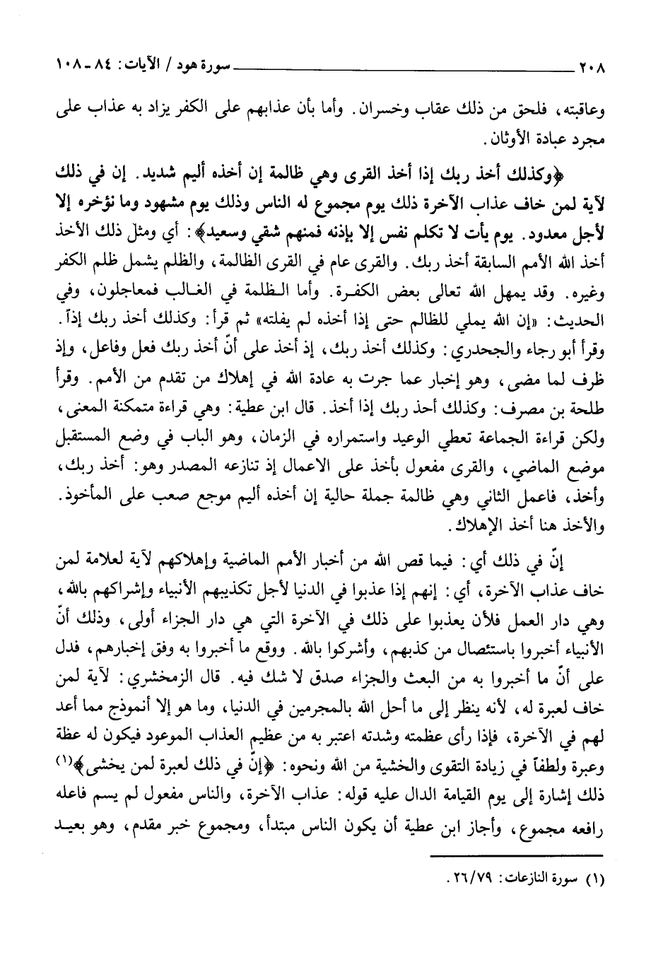 وَكَذلِكَ أَخْذُ رَبِّكَ إِذا أَخَذَ الْقُرى وَهِيَ ظالِمَةٌ إِنَّ أَخْذَهُ أَلِيمٌ شَدِيدٌ. إِنَّ فِي ذلِكَ لَآيَةً لِمَنْ خافَ عَذابَ الْآخِرَةِ ذلِكَ يَوْمٌ مَجْمُوعٌ لَهُ النَّاسُ وَذلِكَ يَوْمٌ مَشْهُودٌ وَما نُؤَخِّرُهُ إِلَّا لِأَجَلٍ مَعْدُودٍ. يَوْمَ يَأْتِ لَا تَكَلَّمُ نَفْسٌ إِلَّا بِإِذْنِهِ فَمِنْهُمْ شَقِيٌّ وَسَعِيدٌ: أَيْ وَمِثْلُ ذَلِكَ الْأَخْذِ أَخْذِ اللَّهِ الْأُمَمَ السَّابِقَةَ أَخْذُ رَبِّكَ. وَالْقُرَى عَامٌّ فِي الْقُرَى الظَّالِمَةِ، وَالظُّلْمُ يَشْمَلُ ظُلْمَ الْكُفْرِ وَغَيْرَهُ. وَقَدْ يُمْهِلُ اللَّهُ تَعَالَى بَعْضَ الْكَفَرَةِ. وَأَمَّا الظَّلَمَةُ فِي الْغَالِبِ فَمُعَاجَلُونَ،