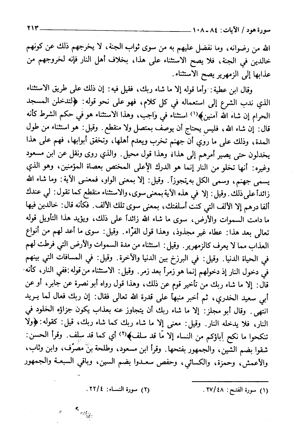 وهذا قول محيل. وَالَّذِي رُوِيَ وَنُقِلَ عَنِ ابْنِ مَسْعُودٍ وَغَيْرِهِ: أَنَّهَا تَخْلُو مِنَ النَّارِ إِنَّمَا هُوَ الدَّرْكُ الْأَعْلَى الْمُخْتَصُّ بِعُصَاةِ الْمُؤْمِنِينَ، وَهُوَ الَّذِي يُسَمَّى جَهَنَّمُ، وَسُمِّيَ الْكُلُّ بِهِ تَجَوُّزًا. وَقِيلَ: إِلَّا بِمَعْنَى الْوَاوِ، فَمَعْنَى الْآيَةِ: وما شَاءَ اللَّهُ زَائِدًا عَلَى ذَلِكَ. وَقِيلَ: إِلَّا فِي هَذِهِ الْآيَةِ بِمَعْنَى سِوَى، وَالِاسْتِثْنَاءُ مُنْقَطِعٌ كَمَا تَقُولُ: لِي عِنْدَكَ أَلْفَا دِرْهَمٍ إِلَّا الْأَلْفَ الَّتِي كُنْتُ أَسْلَفْتُكَ، بِمَعْنَى سِوَى تِلْكَ الْأَلْفِ. فَكَأَنَّهُ قَالَ: خَالِدِينَ فيها ما دامت السموات وَالْأَرْضُ، سِوَى مَا شَاءَ اللَّهُ زَائِدًا عَلَى ذَلِكَ، وَيُؤَيِّدُ هَذَا التَّأْوِيلَ قَوْلُهُ تَعَالَى بَعْدَ هَذَا: عَطَاءً غَيْرَ مَجْذُوذٍ، وَهَذَا قَوْلُ الْفَرَّاءِ. وَقِيلَ: سِوَى مَا أُعِدَّ لَهُمْ مِنَ أَنْوَاعِ الْعَذَابِ مِمَّا لَا يُعْرَفُ كَالزَّمْهَرِيرِ. وَقِيلَ: اسْتِثْنَاءٌ مِنْ مدة السموات وَالْأَرْضِ الَّتِي فَرَطَتْ لَهُمْ فِي الْحَيَاةِ الدُّنْيَا. وَقِيلَ: فِي الْبَرْزَخِ بَيْنَ الدُّنْيَا وَالْآخِرَةِ. وَقِيلَ: فِي الْمَسَافَاتِ الَّتِي بَيْنَهُمْ فِي دُخُولِ النَّارِ إِذْ دُخُولُهُمْ إِنَّمَا هُوَ زُمَرًا بَعْدَ زُمَرٍ. وَقِيلَ: الِاسْتِثْنَاءُ مِنْ قَوْلِهِ: فَفِي النَّارِ، كَأَنَّهُ قَالَ: إِلَّا مَا شَاءَ رَبُّكَ مِنْ تَأْخِيرِ قَوْمٍ عَنْ ذَلِكَ، وَهَذَا قَوْلٌ رَوَاهُ أبو نصرة عَنْ جَابِرٍ، أَوْ عَنْ أَبِي سَعِيدٍ الْخُدْرِيِّ، ثُمَّ أَخْبَرَ مُنَبِّهًا عَلَى قُدْرَةِ اللَّهِ تَعَالَى فَقَالَ: إِنَّ رَبَّكَ فَعَّالٌ لِمَا يُرِيدُ انْتَهَى. وَقَالَ أَبُو مِجْلَزٍ: إِلَّا مَا شَاءَ رَبُّكَ أَنْ يَتَجَاوَزَ عَنْهُ بِعَذَابٍ يَكُونُ جَزَاؤُهُ الْخُلُودَ فِي النَّارِ، فَلَا يُدْخِلُهُ النَّارَ. وَقِيلَ: مَعْنَى إِلَّا مَا شَاءَ رَبُّكَ كَمَا شَاءَ رَبُّكَ، قِيلَ: كَقَوْلِهِ: وَلا تَنْكِحُوا مَا نَكَحَ آباؤُكُمْ مِنَ النِّساءِ إِلَّا مَا قَدْ سَلَفَ «2» أَيْ كَمَا قَدْ سَلَفَ. وَقَرَأَ الْحَسَنُ: