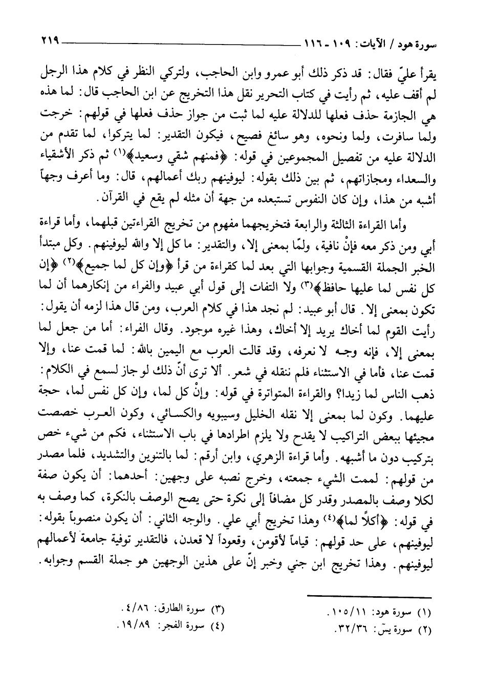 وَأَمَّا الْقِرَاءَةُ الثَّالِثَةُ وَالرَّابِعَةُ فَتَخْرِيجُهُمَا مَفْهُومٌ مِنْ تَخْرِيجِ الْقِرَاءَتَيْنِ قَبْلَهُمَا، وَأَمَّا قِرَاءَةُ أُبَيٍّ وَمَنْ ذُكِرَ مَعَهُ فَإِنَّ نَافِيَةٌ، وَلَمَّا بِمَعْنَى إِلَّا، وَالتَّقْدِيرُ: مَا كُلٌّ إِلَّا وَاللَّهِ لَيُوَفِّيَنَّهُمْ. وَكُلٌّ مُبْتَدَأٌ الخبر الْجُمْلَةُ الْقَسَمِيَّةُ وَجَوَابُهَا الَّتِي بَعْدَ لَمَّا كَقِرَاءَةِ مَنْ قَرَأَ وَإِنْ كُلٌّ لَمَّا جَمِيعٌ «2» إِنْ كُلُّ نَفْسٍ لَمَّا عَلَيْها حافِظٌ «3» وَلَا الْتِفَاتَ إِلَى قَوْلِ أَبِي عُبَيْدٍ وَالْفَرَّاءِ مِنْ إِنْكَارِهِمَا أَنَّ لَمَّا تَكُونُ بِمَعْنَى إِلَّا. قَالَ أَبُو عُبَيْدٍ: لَمْ نَجِدْ هَذَا فِي كَلَامِ الْعَرَبِ، وَمَنْ قَالَ هَذَا لَزِمَهُ أَنْ يَقُولَ: