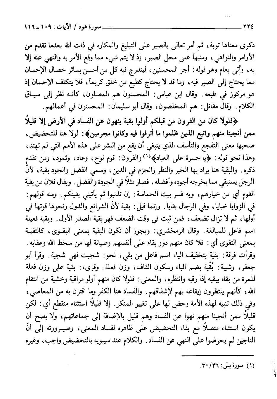 وَقَرَأَتْ فِرْقَةٌ: بَقِيَةٍ بِتَخْفِيفِ الْيَاءِ اسْمُ فَاعِلٍ مِنْ بَقِيَ، نَحْوُ: شَجِيَتْ فَهِيَ شَجِيَّةٌ. وَقَرَأَ أَبُو جَعْفَرٍ، وَشَيْبَةُ: بُقْيَةٍ بِضَمِّ الْبَاءِ وسكون القاف، وَزْنِ فُعْلَةٍ. وَقُرِيءَ: بَقْيَةٍ عَلَى وَزْنِ فَعْلَةٍ لِلْمَرَّةِ من بقاه يبقيه إِذَا رَقَبَهُ وَانْتَظَرَهُ، وَالْمَعْنَى: فَلَوْلَا كَانَ مِنْهُمْ أُولُو مُرَاقَبَةٍ وَخَشْيَةٍ مِنِ انْتِقَامِ اللَّهِ، كَأَنَّهُمْ يَنْتَظِرُونَ إِيقَاعَهُ بِهِمْ لِإِشْفَاقِهِمْ. وَالْفَسَادُ هُنَا الْكُفْرُ وَمَا اقْتَرَنَ بِهِ مِنَ الْمَعَاصِي، وَفِي ذَلِكَ تَنْبِيهٌ لِهَذِهِ الْأُمَّةِ وَحَضٌّ لَهَا عَلَى تَغْيِيرِ الْمُنْكِرِ. إِلَّا قَلِيلًا اسْتِثْنَاءٌ مُنْقَطِعٌ أَيْ: لَكِنَّ قَلِيلًا مِمَّنْ أَنْجَيْنَا مِنْهُمْ نَهَوْا عَنِ الْفَسَادِ وَهُمْ قَلِيلٌ بِالْإِضَافَةِ إِلَى جَمَاعَاتِهِمْ، وَلَا يَصِحُّ أَنْ يَكُونَ اسْتِثْنَاءً مُتَّصِلًا مَعَ بَقَاءِ التَّحْضِيضِ عَلَى ظَاهِرِهِ لِفَسَادِ الْمَعْنَى، وَصَيْرُورَتِهِ إِلَى أَنَّ النَّاجِينَ لَمْ يُحَرِّضُوا عَلَى النَّهْيِ عَنِ الْفَسَادِ. وَالْكَلَامُ عِنْدَ سِيبَوَيْهِ بالتحضيض واجب، وغيره
