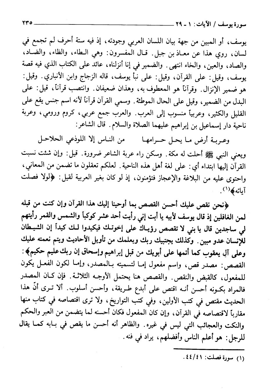 وَيَعْنِي النَّبِيَّ صَلَّى اللَّهُ عَلَيْهِ وَسَلَّمَ أُحِلَّتْ لَهُ مَكَّةُ. وَسَكَّنَ رَاءَ عَرْبَةُ الشَّاعِرُ ضَرُورَةً. قِيلَ: وَإِنْ شِئْتَ نَسَبْتَ الْقُرْآنَ إِلَيْهَا ابْتِدَاءً أَيْ: عَلَى لُغَةِ أَهْلِ هَذِهِ النَّاحِيَةِ. لَعَلَّكُمْ تَعْقِلُونَ مَا تَضَمَّنَ مِنَ الْمَعَانِي، وَاحْتَوَى عَلَيْهِ مِنَ الْبَلَاغَةِ وَالْإِعْجَازِ فَتُؤْمِنُونَ، إِذْ لَوْ كَانَ بِغَيْرِ الْعَرَبِيَّةِ لَقِيلَ: لَوْلا فُصِّلَتْ آياتُهُ «1» .