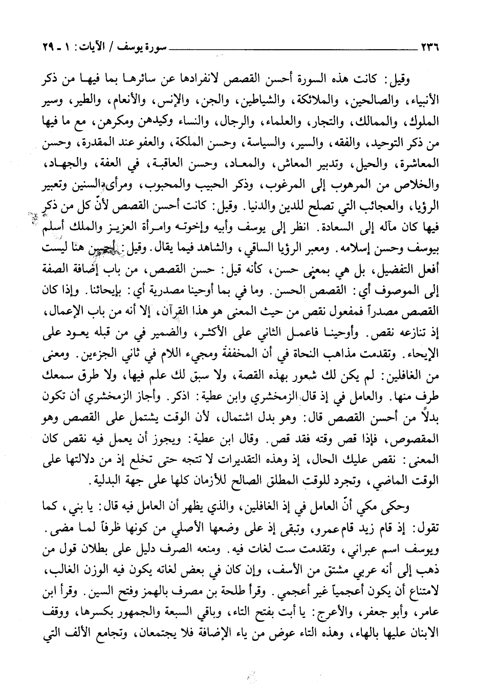 وَقِيلَ: كَانَتْ هَذِهِ السُّورَةُ أَحْسَنَ الْقَصَصِ لِانْفِرَادِهَا عَنْ سَائِرِهَا بِمَا فِيهَا مِنْ ذِكْرِ الْأَنْبِيَاءِ، وَالصَّالِحِينَ، وَالْمَلَائِكَةِ، وَالشَّيَاطِينِ، وَالْجِنِّ، وَالْإِنْسِ، وَالْأَنْعَامِ، وَالطَّيْرِ، وَسِيَرِ الْمُلُوكِ، وَالْمَمَالِكِ، وَالتُّجَّارِ، وَالْعُلَمَاءِ، وَالرِّجَالِ، وَالنِّسَاءِ وَكَيْدِهِنَّ وَمَكْرِهِنَّ، مَعَ مَا فِيهَا مِنَ ذِكْرِ التَّوْحِيدِ، وَالْفِقْهِ، وَالسِّيَرِ، وَالسِّيَاسَةِ، وَحُسْنِ الْمِلْكَةِ، وَالْعَفْوِ عِنْدَ الْمَقْدِرَةِ، وَحُسْنِ الْمُعَاشَرَةِ، وَالْحِيَلِ، وَتَدْبِيرِ الْمَعَاشِ، وَالْمَعَادِ، وَحُسْنِ الْعَاقِبَةِ، فِي الْعِفَّةِ، وَالْجِهَادِ، وَالْخَلَاصِ مِنَ الْمَرْهُوبِ إِلَى الْمَرْغُوبِ، وَذِكْرِ الْحَبِيبِ وَالْمَحْبُوبِ، وَمَرْأَى السِّنِينَ وَتَعْبِيرِ الرُّؤْيَا، وَالْعَجَائِبِ الَّتِي تَصْلُحُ لِلدِّينِ وَالدُّنْيَا. وَقِيلَ: كَانَتْ أَحْسَنَ الْقَصَصِ لِأَنَّ كُلَّ مَنْ ذُكِرَ فِيهَا كَانَ مَآلُهُ إِلَى السَّعَادَةِ. انْظُرْ إِلَى يُوسُفَ وَأَبِيهِ وَإِخْوَتِهِ وَامْرَأَةِ الْعَزِيزِ والملك أسلم بيوسف وَحَسُنَ إِسْلَامُهُ. وَمُعَبِّرِ الرُّؤْيَا السَّاقِي، وَالشَّاهِدِ فِيمَا يُقَالُ. وَقِيلَ: أَحْسُنُ هُنَا لَيْسَتْ أَفْعَلَ التَّفْضِيلِ، بَلْ هِيَ بِمَعْنَى حَسَنٍ، كَأَنَّهُ قِيلَ: حَسَنَ الْقَصَصِ، مِنْ بَابِ إِضَافَةِ الصِّفَةِ إِلَى الْمَوْصُوفِ أي: القصص الحسن. وما في بما أَوْحَيْنَا مَصْدَرِيَّةٌ أَيْ: بِإِيحَائِنَا. وَإِذَا كَانَ الْقَصَصُ مَصْدَرًا فَمَفْعُولُ نَقُصُّ مِنْ حَيْثُ الْمَعْنَى هُوَ هَذَا الْقُرْآنَ، إِلَّا أَنَّهُ مِنْ بَابِ الْإِعْمَالِ، إِذْ تَنَازَعَهُ نَقُصُّ. وأوحينا فَأُعْمِلَ الثَّانِي عَلَى الْأَكْثَرِ، وَالضَّمِيرُ فِي مِنْ قَبْلِهِ يَعُودُ عَلَى الْإِيحَاءِ. وَتَقَدَّمَتْ مَذَاهِبُ النُّحَاةِ فِي أَنِ الْمُخَفَّفَةِ وَمَجِيءِ اللَّامِ فِي ثاني الجزءين. وَمَعْنَى مِنَ الْغَافِلِينَ: لَمْ يَكُنْ لَكَ شُعُورٌ بِهَذِهِ الْقِصَّةِ، وَلَا سَبَقَ لَكَ عِلْمٌ فِيهَا، وَلَا طَرَقَ سَمْعَكَ طَرَفٌ مِنْهَا. وَالْعَامِلُ فِي إِذْ قَالَ الزَّمَخْشَرِيُّ وَابْنُ عَطِيَّةَ: اذْكُرْ. وَأَجَازَ الزَّمَخْشَرِيُّ أَنْ تَكُونَ بَدَلًا مِنْ أَحْسَنَ الْقَصَصِ قَالَ: وَهُوَ بَدَلُ اشْتِمَالٍ، لِأَنَّ الْوَقْتَ يَشْتَمِلُ عَلَى الْقَصَصِ وَهُوَ الْمَقْصُوصُ، فَإِذَا قَصَّ وَقْتَهُ فَقَدْ قَصَّ. وَقَالَ ابْنُ عَطِيَّةَ: وَيَجُوزُ أَنْ يَعْمَلَ فِيهِ نَقُصُّ كَانَ الْمَعْنَى: نَقُصُّ عَلَيْكَ الْحَالَ، إِذْ وَهَذِهِ التَّقْدِيرَاتُ لَا تَتَّجِهُ حَتَّى تُخْلَعَ إِذْ مِنْ دَلَالَتِهَا عَلَى الْوَقْتِ الْمَاضِي، وَتُجَرَّدَ لِلْوَقْتِ الْمُطْلَقِ الصَّالِحِ لِلْأَزْمَانِ كُلِّهَا عَلَى جِهَةِ الْبَدَلِيَّةِ.
