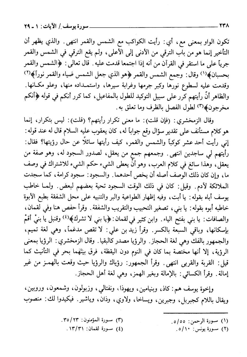 تَكُونَ الْوَاوُ بِمَعْنَى مَعَ، أَيْ: رَأَيْتُ الْكَوَاكِبَ مَعَ الشَّمْسِ وَالْقَمَرِ انْتَهَى. وَالَّذِي يَظْهَرُ أَنَّ التَّأْخِيرَ إِنَّمَا هُوَ مِنْ بَابِ التَّرَقِّي مِنَ الْأَدْنَى إِلَى الْأَعْلَى، وَلَمْ يَقَعِ التَّرَقِّي فِي الشَّمْسِ وَالْقَمَرِ جَرْيًا عَلَى مَا اسْتَقَرَّ فِي الْقُرْآنِ مِنْ أَنَّهُ إِذَا اجْتَمَعَا قُدِّمَتْ عَلَيْهِ. قَالَ تَعَالَى: الشَّمْسُ وَالْقَمَرُ بِحُسْبانٍ «1» وَقَالَ: وَجُمِعَ الشَّمْسُ وَالْقَمَرُ هُوَ الَّذِي جَعَلَ الشَّمْسَ ضِياءً وَالْقَمَرَ نُوراً «2» وَقُدِّمَتْ عَلَيْهِ لِسُطُوعِ نُورِهَا وَكِبَرِ جَرْمِهَا وَغَرَابَةِ سَيْرِهَا، وَاسْتِمْدَادِهِ مِنْهَا، وَعُلُوِّ مَكَانِهَا.