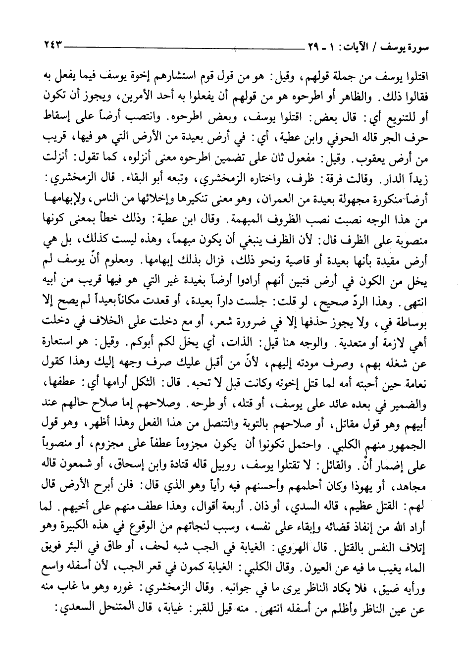 أَرْضًا مَنْكُورَةٌ مَجْهُولَةٌ بَعِيدَةٌ مِنَ الْعُمْرَانِ، وَهُوَ مَعْنَى تَنْكِيرِهَا وَإِخْلَائِهَا مِنَ النَّاسِ، وَلِإِبْهَامِهَا مِنْ هَذَا الْوَجْهِ نُصِبَتْ نَصْبَ الظُّرُوفِ الْمُبْهَمَةِ. وَقَالَ ابْنُ عَطِيَّةَ: وَذَلِكَ خَطَأٌ بِمَعْنَى كَوْنِهَا مَنْصُوبَةً عَلَى الظَّرْفِ قَالَ: لِأَنَّ الظَّرْفَ يَنْبَغِي أَنْ يَكُونَ مُبْهَمًا، وَهَذِهِ لَيْسَتْ كَذَلِكَ، بَلْ هِيَ أَرْضٌ مُقَيَّدَةٌ بِأَنَّهَا بَعِيدَةٌ أَوْ قَاصِيَةٌ وَنَحْوُ ذَلِكَ، فَزَالَ بِذَلِكَ إِبْهَامُهَا. وَمَعْلُومٌ أَنَّ يُوسُفَ لَمْ يَخْلُ مِنَ الْكَوْنِ فِي أَرْضٍ فَتَبَيَّنَ أَنَّهُمْ أَرَادُوا أَرْضًا بَعِيدَةً غَيْرَ الَّتِي هُوَ فِيهَا قَرِيبٌ مِنْ أَبِيهِ انْتَهَى. وَهَذَا الرَّدُّ صَحِيحٌ، لَوْ قُلْتَ: جَلَسْتُ دَارًا بَعِيدَةً، أَوْ قَعَدْتُ مَكَانًا بَعِيدًا لَمْ يَصِحَّ إِلَّا بِوَسَاطَةِ فِي، وَلَا يَجُوزُ حَذْفُهَا إِلَّا فِي ضَرُورَةِ شِعْرٍ، أَوْ مَعَ دَخَلْتُ عَلَى الْخِلَافِ فِي دَخَلْتُ أَهِيَ لَازِمَةٌ أَوْ مُتَعَدِّيَةٌ. وَالْوَجْهُ هُنَا قِيلَ: الذَّاتُ، أَيْ يَخْلُ لَكُمْ أَبُوكُمْ. وَقِيلَ: هُوَ اسْتِعَارَةٌ عَنْ شَغْلِهِ بِهِمْ، وَصَرْفِ مَوَدَّتِهِ إِلَيْهِمْ، لِأَنَّ مَنْ أَقْبَلَ عَلَيْكَ صَرَفَ وَجْهَهُ إِلَيْكَ وَهَذَا كَقَوْلِ نَعَامَةَ حِينَ أَحَبَّتْهُ أُمُّهُ لَمَّا قَتَلَ إِخْوَتَهُ وَكَانَتْ قَبْلُ لَا تُحِبُّهُ. قَالَ: الثَّكْلُ أَرَامَهَا أَيْ: عَطَفَهَا، وَالضَّمِيرُ فِي بَعْدِهِ عَائِدٌ عَلَى يُوسُفَ، أَوْ قَتْلِهِ، أَوْ طَرْحِهِ. وَصَلَاحُهُمْ إِمَّا صَلَاحُ حَالِهِمْ عِنْدَ أَبِيهِمْ وَهُوَ قَوْلُ مُقَاتِلٍ، أَوْ صَلَاحُهُمْ بِالتَّوْبَةِ وَالتَّنَصُّلِ مِنْ هَذَا الْفِعْلِ وَهَذَا أَظْهَرُ، وَهُوَ قَوْلُ الْجُمْهُورِ مِنْهُمْ الْكَلْبِيُّ. وَاحْتَمَلَ تَكُونُوا أَنْ يَكُونَ مَجْزُومًا عَطْفًا عَلَى مَجْزُومٍ، أَوْ مَنْصُوبًا عَلَى إِضْمَارِ أَنْ. وَالْقَائِلُ: لَا تَقْتُلُوا يُوسُفَ، رُوبِيلُ قَالَهُ قَتَادَةُ وَابْنُ إِسْحَاقَ، أَوْ شَمْعُونُ قَالَهُ مُجَاهِدٌ، أَوْ يَهُوذَا وَكَانَ أَحَلَمَهُمْ وَأَحْسَنَهُمْ فِيهِ رَأْيًا وَهُوَ الَّذِي قَالَ: فَلَنْ أَبْرَحَ الْأَرْضَ قَالَ لَهُمْ: الْقَتْلُ عَظِيمٌ، قَالَهُ السدي، أو ذان. أَرْبَعَةِ أَقْوَالٍ، وَهَذَا عَطْفٌ مِنْهُمْ عَلَى أَخِيهِمْ. لِمَا أَرَادَ اللَّهُ مِنْ إِنْفَاذِ قَضَائِهِ وَإِبْقَاءٍ عَلَى نَفْسِهِ، وَسَبَبٍ لِنَجَاتِهِمْ مِنَ الْوُقُوعِ فِي هَذِهِ الْكَبِيرَةِ وَهُوَ إِتْلَافُ النَّفْسِ بِالْقَتْلِ. قَالَ الْهَرَوِيُّ: الْغَيَابَةُ فِي الْجُبِّ شَبَهُ لِحْفٍ، أَوْ طَاقٍ فِي الْبِئْرِ فُوَيْقَ الْمَاءِ يَغِيبُ مَا فِيهِ عَنِ الْعُيُونِ. وَقَالَ الْكَلْبِيُّ: الْغَيَابَةُ كُمُونٌ فِي قَعْرِ الْجُبِّ، لأن أسفله واسع ورأيه ضَيِّقٌ، فَلَا يَكَادُ النَّاظِرُ يَرَى مَا فِي جَوَانِبِهِ. وَقَالَ الزَّمَخْشَرِيُّ: غَوْرُهُ وَهُوَ مَا غَابَ مِنْهُ عَنْ عَيْنِ النَّاظِرِ وَأَظْلَمُ مِنْ أَسْفَلِهِ انْتَهَى. مِنْهُ قِيلَ للقبر: غيابة، قال المتنحل السَّعْدِيُّ.
