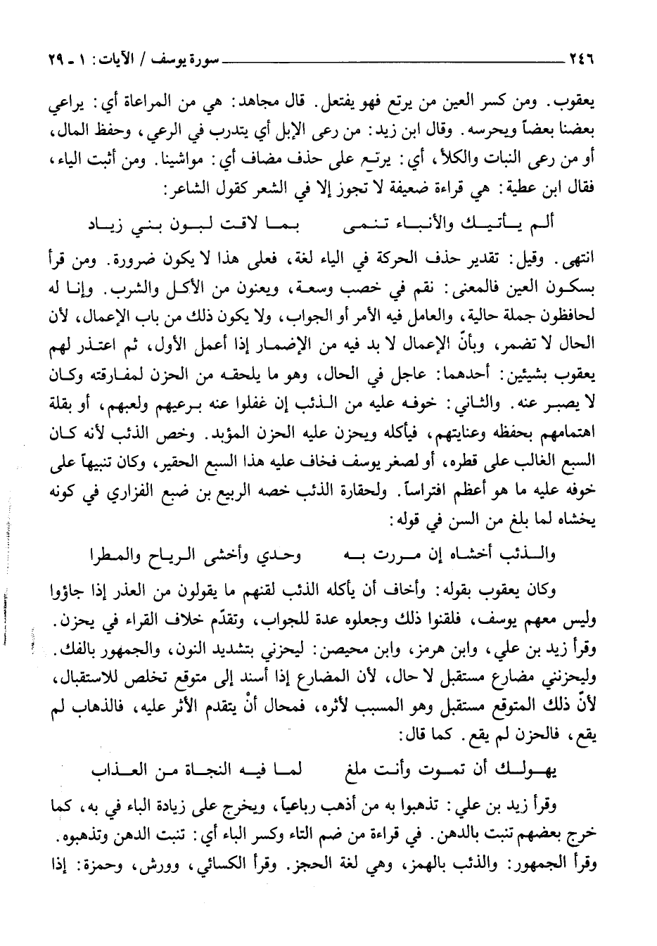 انْتَهَى. وَقِيلَ: تَقْدِيرُ حَذْفِ الْحَرَكَةِ فِي الْيَاءِ لُغَةٌ، فَعَلَى هَذَا لَا يَكُونُ ضَرُورَةً. وَمَنْ قَرَأَ بِسُكُونِ الْعَيْنِ فَالْمَعْنَى: نَقُمْ فِي خِصْبٍ وَسَعَةٍ، وَيَعْنُونَ مِنَ الْأَكْلِ وَالشُّرْبِ. وَإِنَّا لَهُ لَحَافِظُونَ جُمْلَةٌ حَالِيَّةٌ، وَالْعَامِلُ فِيهِ الْأَمْرُ أَوِ الْجَوَابُ، وَلَا يَكُونُ ذَلِكَ مِنْ بَابِ الْإِعْمَالِ، لِأَنَّ الْحَالَ لَا تُضْمَرُ، وَبِأَنَّ الْإِعْمَالَ لَا بُدَّ فِيهِ مِنَ الْإِضْمَارِ إِذَا أُعْمِلَ الْأَوَّلُ، ثُمَّ اعْتَذَرَ لَهُمْ يَعْقُوبُ بِشَيْئَيْنِ: أَحَدُهُمَا: عَاجِلٌ فِي الْحَالِ، وَهُوَ مَا يَلْحَقُهُ مِنَ الْحُزْنِ لِمُفَارَقَتِهِ وَكَانَ لَا يَصْبِرُ عَنْهُ. وَالثَّانِي: خَوْفُهُ عَلَيْهِ مِنَ الذِّئْبِ إِنْ غَفَلُوا عَنْهُ بِرِعْيِهِمْ وَلَعِبِهِمْ، أَوْ بِقِلَّةِ اهْتِمَامِهِمْ بِحِفْظِهِ وَعِنَايَتِهِمْ، فَيَأْكُلُهُ وَيَحْزَنُ عَلَيْهِ الْحُزْنَ الْمُؤَبَّدَ. وَخَصَّ الذِّئْبَ لِأَنَّهُ كَانَ السَّبُعَ الْغَالِبَ عَلَى قُطْرِهِ، أَوْ لِصِغَرِ يُوسُفَ فَخَافَ عَلَيْهِ هَذَا السَّبُعَ الْحَقِيرَ، وَكَانَ تَنْبِيهًا عَلَى خَوْفِهِ عَلَيْهِ مَا هُوَ أَعْظَمُ افْتِرِاسًا. وَلِحَقَارَةِ الذِّئْبِ خَصَّهُ الرَّبِيعُ بْنُ ضَبُعٍ الْفَزَارِيُّ فِي كَوْنِهِ يَخْشَاهُ لَمَّا بَلَغَ مِنَ السِّنِّ فِي قَوْلِهِ: