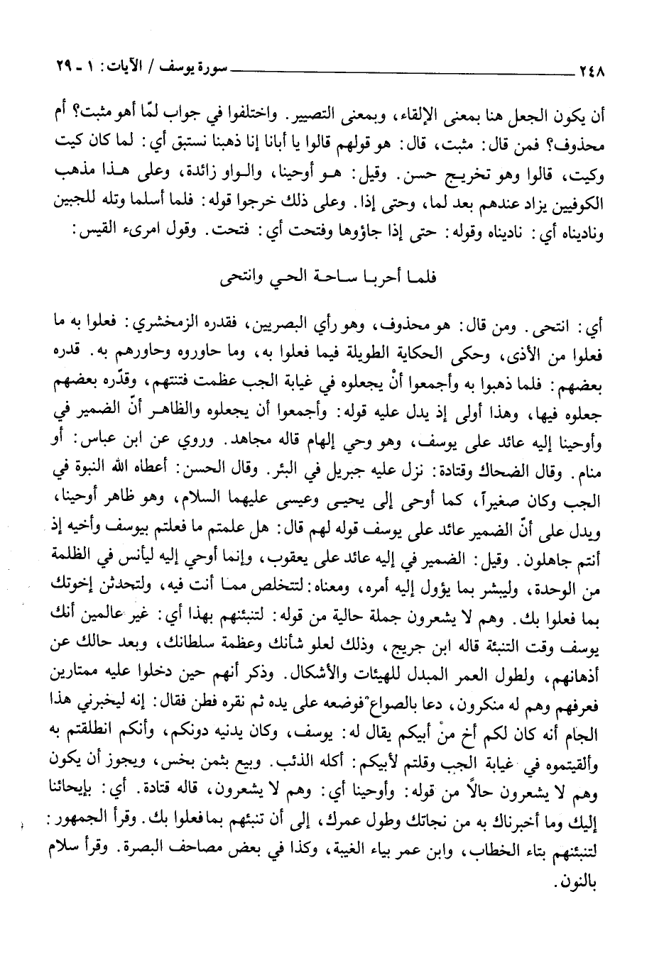 فلما أحربا سَاحَةَ الْحَيِّ وَانْتَحَى أَيِ: انْتَحَى. وَمَنْ قَالَ: هُوَ مَحْذُوفٌ، وَهُوَ رَأْيُ الْبَصْرِيِّينَ، فَقَدَّرَهُ الزَّمَخْشَرِيُّ: فَعَلُوا بِهِ مَا فَعَلُوا مِنَ الْأَذَى، وَحَكَى الْحِكَايَةَ الطَّوِيلَةَ فِيمَا فَعَلُوا بِهِ، وَمَا حَاوَرُوهُ وَحَاوَرَهُمْ بِهِ. قَدَّرَهُ بَعْضُهُمْ: فَلَمَّا ذَهَبُوا بِهِ وَأَجْمَعُوا أَنْ يَجْعَلُوهُ فِي غَيَابَةِ الْجُبِّ عَظُمَتْ فِتْنَتُهُمْ، وَقَدَّرَهُ بَعْضُهُمْ جَعَلُوهُ فِيهَا، وَهَذَا أَوْلَى إِذْ يَدُلُّ عَلَيْهِ قَوْلُهُ: وَأَجْمَعُوا أَنْ يَجْعَلُوهُ وَالظَّاهِرُ أَنَّ الضَّمِيرَ فِي وَأَوْحَيْنَا إِلَيْهِ عَائِدٌ عَلَى يُوسُفَ، وَهُوَ وَحْيُ إِلْهَامٍ قَالَهُ مُجَاهِدٌ. وَرُوِيَ عَنِ ابْنِ عَبَّاسٍ: أَوْ مَنَامٍ. وَقَالَ الضَّحَّاكُ وَقَتَادَةُ: نَزَلَ عَلَيْهِ جِبْرِيلُ فِي الْبِئْرِ. وَقَالَ الْحَسَنُ: أَعْطَاهُ اللَّهُ النُّبُوَّةَ فِي الْجُبِّ وَكَانَ صَغِيرًا، كَمَا أَوْحَى إِلَى يَحْيَى وَعِيسَى عَلَيْهِمَا السَّلَامُ، وَهُوَ ظَاهِرُ أَوْحَيْنَا، وَيَدُلُّ عَلَى أَنَّ الضَّمِيرَ عَائِدٌ عَلَى يُوسُفَ قَوْلُهُ لَهُمْ قَالَ: هَلْ عَلِمْتُمْ مَا فَعَلْتُمْ بِيُوسُفَ وَأَخِيهِ إِذْ أَنْتُمْ جَاهِلُونَ. وَقِيلَ: الضَّمِيرُ فِي إِلَيْهِ عَائِدٌ عَلَى يَعْقُوبَ، وَإِنَّمَا أُوحِيَ إِلَيْهِ لِيَأْنَسَ فِي الظُّلْمَةِ مِنَ الوحدة، وليبشر بما يؤول إليه أمره، ومعناه: لتتخلص مِمَّا أَنْتَ فِيهِ، وَلَتُحَدِّثَنَّ إِخْوَتَكَ بِمَا فَعَلُوا بِكَ. وَهُمْ لَا يَشْعُرُونَ جُمْلَةٌ حَالِيَّةٌ مِنْ قَوْلِهِ: لَتُنَبِّئَنَّهُمْ بهذا أَيْ: غَيْرَ عَالِمِينَ أَنَّكَ يُوسُفُ وَقْتَ التَّنْبِئَةِ قَالَهُ ابْنُ جُرَيْجٍ، وَذَلِكَ لِعُلُوِّ شَأْنِكَ وَعَظَمَةِ سُلْطَانِكَ، وَبُعْدِ حَالِكَ عَنْ أَذْهَانِهِمْ، وَلِطُولِ الْعُمُرِ الْمُبْدِلِ لِلْهَيْئَاتِ وَالْأَشْكَالِ.