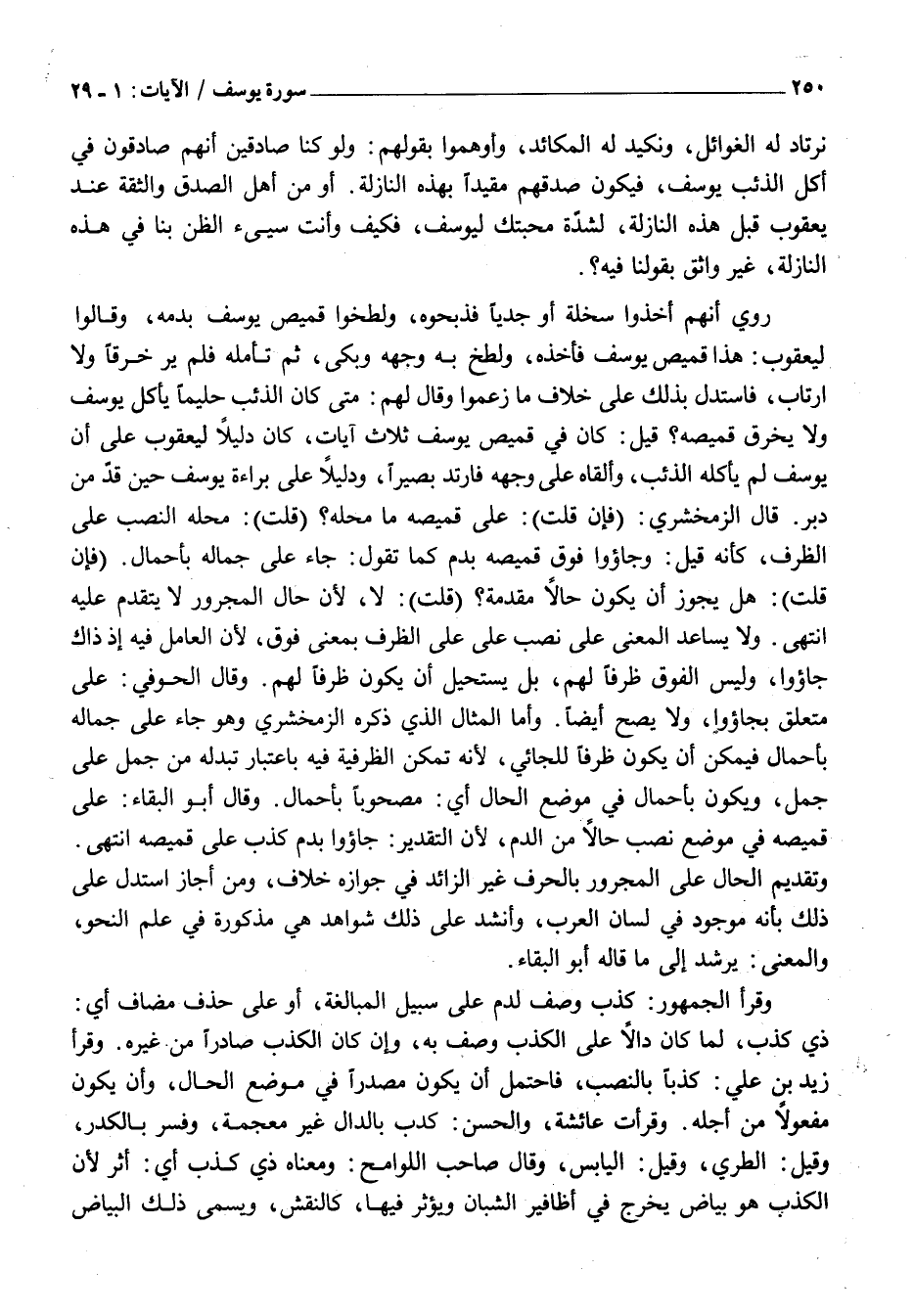 قِيلَ: كَانَ فِي قَمِيصِ يُوسُفَ ثَلَاثُ آيَاتٍ، كَانَ دَلِيلًا لِيَعْقُوبَ عَلَى أَنَّ يُوسُفَ لَمْ يَأْكُلْهُ الذِّئْبُ، وَأَلْقَاهُ عَلَى وَجْهِهِ فَارْتَدَّ بَصِيرًا، وَدَلِيلًا عَلَى بَرَاءَةِ يُوسُفَ حِينَ قُدَّ مِنْ دُبُرٍ. قَالَ الزَّمَخْشَرِيُّ: (فَإِنْ قُلْتَ) : عَلَى قَمِيصِهِ مَا مَحَلُّهُ؟ (قُلْتُ) : مَحَلُّهُ النَّصْبُ عَلَى الظَّرْفِ، كأنه قيل: وجاؤوا فَوْقَ قَمِيصِهِ بِدَمٍ كَمَا تَقُولُ: جَاءَ عَلَى جِمَالِهِ بِأَحْمَالٍ. (فَإِنْ قُلْتَ) : هَلْ يَجُوزُ أَنْ يَكُونَ حَالًا مُقَدَّمَةً؟ (قُلْتُ) : لَا، لِأَنَّ حَالَ الْمَجْرُورِ لَا يَتَقَدَّمُ عَلَيْهِ انْتَهَى. وَلَا يُسَاعِدُ الْمَعْنَى عَلَى نَصْبِ عَلَى عَلَى الظَّرْفِ بِمَعْنَى فَوْقَ، لِأَنَّ الْعَامِلَ فِيهِ إِذْ ذاك جاؤوا، وَلَيْسَ الْفَوْقُ ظَرْفًا لَهُمْ، بَلْ يَسْتَحِيلُ أَنْ يَكُونَ ظَرْفًا لَهُمْ. وَقَالَ الْحَوْفِيُّ: على متعلق بجاءوا، وَلَا يَصِحُّ أَيْضًا. وَأَمَّا الْمِثَالُ الَّذِي ذَكَرَهُ الزَّمَخْشَرِيُّ وَهُوَ جَاءَ عَلَى جِمَالِهِ بِأَحْمَالٍ فَيُمْكِنُ أَنْ يَكُونَ ظَرْفًا لِلْجَائِي، لِأَنَّهُ تَمَكَّنَ الظَّرْفِيَّةُ فِيهِ بِاعْتِبَارِ تَبَدُّلِهِ مِنْ جَمَلٍ عَلَى جَمَلٍ، وَيَكُونُ بِأَحْمَالٍ فِي مَوْضِعِ الْحَالِ أَيْ: مَصْحُوبًا بِأَحْمَالٍ. وَقَالَ أَبُو الْبَقَاءِ: عَلَى قَمِيصِهِ فِي مَوْضِعِ نَصْبٍ حَالًا مِنَ الدَّمِ، لِأَنَّ التقدير: جاؤوا بِدَمٍ كَذِبٍ عَلَى قَمِيصِهِ انْتَهَى.