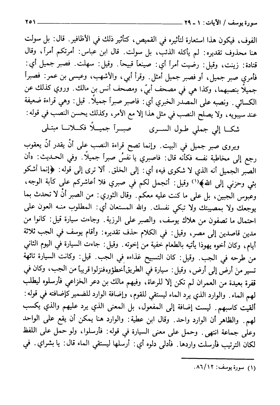 وَيُرْوَى صَبْرٌ جَمِيلٌ فِي الْبَيْتِ. وَإِنَّمَا تَصِحُّ قِرَاءَةُ النَّصْبِ عَلَى أَنْ يُقَدَّرَ أَنَّ يَعْقُوبَ رَجَعَ إِلَى مُخَاطَبَةِ نَفْسِهِ فَكَأَنَّهُ قَالَ: فَاصْبِرِي يَا نَفْسُ صَبْرًا جَمِيلًا.