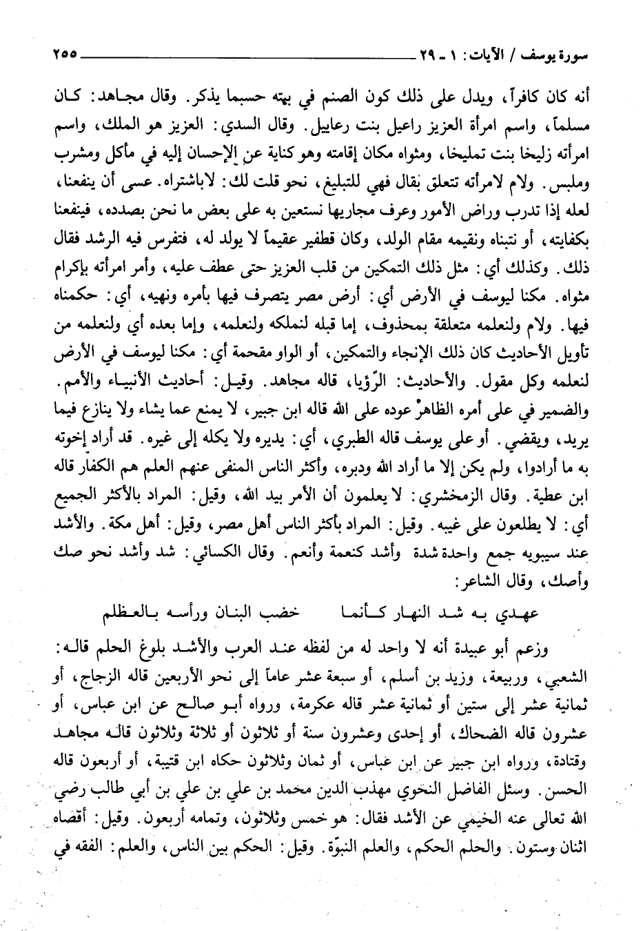 الشَّعْبِيُّ، وَرَبِيعَةُ، وَزَيْدُ بْنُ أَسْلَمَ، أَوْ سَبْعَةَ عَشَرَ عَامًا إِلَى نَحْوِ الْأَرْبَعِينَ قَالَهُ الزَّجَّاجُ، أَوْ ثَمَانِيَةَ عَشَرَ إِلَى سِتِّينَ أَوْ ثَمَانِيَةَ عَشَرَ قَالَهُ عِكْرِمَةُ، وَرَوَاهُ أَبُو صَالِحٍ عَنِ ابْنِ عَبَّاسٍ، أَوْ عِشْرُونَ قَالَهُ الضَّحَّاكُ، أَوْ إِحْدَى وَعِشْرُونَ سَنَةً أَوْ ثَلَاثُونَ أَوْ ثَلَاثَةٌ وَثَلَاثُونَ قَالَهُ مُجَاهِدٌ وَقَتَادَةُ، وَرَوَاهُ ابْنُ جُبَيْرٍ عَنِ ابْنِ عَبَّاسٍ، أَوْ ثَمَانٌ وَثَلَاثُونَ حَكَاهُ ابْنُ قُتَيْبَةَ، أَوْ أَرْبَعُونَ قَالَهُ الْحَسَنُ. وَسُئِلَ الْفَاضِلُ النَّحْوِيُّ مُهَذِّبُ الدِّينِ مُحَمَّدُ بْنُ عَلِيِّ بْنِ علي بن أبي طَالِبٍ رَضِيَ اللَّهُ تَعَالَى عَنْهُ الْخَيْمِيُّ عَنِ الْأَشُدِّ فَقَالَ: هُوَ خَمْسٌ وَثَلَاثُونَ، وَتَمَامُهُ أَرْبَعُونَ. وَقِيلَ: أَقْصَاهُ اثْنَانِ وَسِتُّونَ. وَالْحُلُمُ الْحُكْمُ، وَالْعِلْمُ النُّبُوَّةُ. وَقِيلَ: الْحُكْمُ بَيْنَ النَّاسِ، وَالْعِلْمُ: الْفِقْهُ فِي