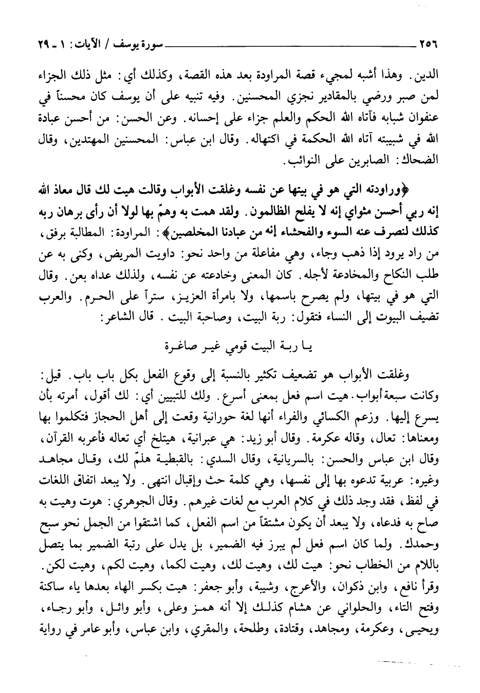 وَراوَدَتْهُ الَّتِي هُوَ فِي بَيْتِها عَنْ نَفْسِهِ وَغَلَّقَتِ الْأَبْوابَ وَقالَتْ هَيْتَ لَكَ قالَ مَعاذَ اللَّهِ إِنَّهُ رَبِّي أَحْسَنَ مَثْوايَ إِنَّهُ لَا يُفْلِحُ الظَّالِمُونَ. وَلَقَدْ هَمَّتْ بِهِ وَهَمَّ بِها لَوْلا أَنْ رَأى بُرْهانَ رَبِّهِ كَذلِكَ لِنَصْرِفَ عَنْهُ السُّوءَ وَالْفَحْشاءَ إِنَّهُ مِنْ عِبادِنَا الْمُخْلَصِينَ: الْمُرَاوَدَةُ: الْمُطَالَبَةُ بِرِفْقٍ، مِنْ رَادَ يَرُودُ إِذَا ذَهَبَ وَجَاءَ، وَهِيَ مُفَاعَلَةٌ مِنْ وَاحِدٍ نَحْوَ: دَاوَيْتُ الْمَرِيضَ، وَكُنِّيَ بِهِ عَنْ طَلَبِ النِّكَاحِ وَالْمُخَادَعَةِ لِأَجْلِهِ. كَانَ الْمَعْنَى وَخَادَعَتْهُ عَنْ نَفْسِهِ، وَلِذَلِكَ عَدَّاهُ بعن. وَقَالَ الَّتِي هُوَ فِي بَيْتِهَا، وَلَمْ يُصَرِّحْ بِاسْمِهَا، وَلَا بِامْرَأَةِ الْعَزِيزِ، سِتْرًا عَلَى الْحُرُمِ. وَالْعَرَبُ تُضِيفُ الْبُيُوتَ إِلَى النِّسَاءِ فَتَقُولُ: رَبَّةُ الْبَيْتِ، وَصَاحِبَةُ الْبَيْتِ. قَالَ الشَّاعِرُ: