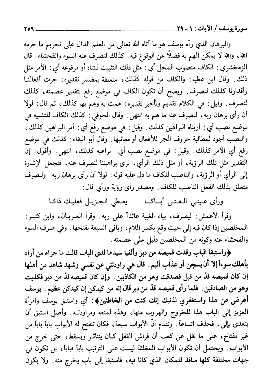 وَاسْتَبَقَا الْبابَ وَقَدَّتْ قَمِيصَهُ مِنْ دُبُرٍ وَأَلْفَيا سَيِّدَها لَدَى الْبابِ قالَتْ مَا جَزاءُ مَنْ أَرادَ بِأَهْلِكَ سُوءاً إِلَّا أَنْ يُسْجَنَ أَوْ عَذابٌ أَلِيمٌ. قالَ هِيَ راوَدَتْنِي عَنْ نَفْسِي وَشَهِدَ شاهِدٌ مِنْ أَهْلِها إِنْ كانَ قَمِيصُهُ قُدَّ مِنْ قُبُلٍ فَصَدَقَتْ وَهُوَ مِنَ الْكاذِبِينَ. وَإِنْ كانَ قَمِيصُهُ قُدَّ مِنْ دُبُرٍ فَكَذَبَتْ وَهُوَ مِنَ الصَّادِقِينَ. فَلَمَّا رَأى قَمِيصَهُ قُدَّ مِنْ دُبُرٍ قالَ إِنَّهُ مِنْ كَيْدِكُنَّ إِنَّ كَيْدَكُنَّ عَظِيمٌ. يُوسُفُ أَعْرِضْ عَنْ هَذَا وَاسْتَغْفِرِي لِذَنْبِكِ إِنَّكِ كُنْتِ مِنَ الْخاطِئِينَ: أَيْ وَاسْتَبَقَ يُوسُفُ وَامْرَأَةُ الْعَزِيزِ إِلَى الْبَابِ هَذَا لِلْخُرُوجِ وَالْهُرُوبِ مِنْهَا، وَهَذِهِ لِمَنْعِهِ وَمُرَاوَدَتِهِ. وَأَصْلُ اسْتَبَقَ أَنْ يَتَعَدَّى بِإِلَى، فَحُذِفَ اتِّسَاعًا. وَتَقَدَّمَ أَنَّ الْأَبْوَابَ سَبْعَةٌ، فَكَانَ تَنْفَتِحُ لَهُ الْأَبْوَابُ بَابًا بَابًا مِنْ غَيْرِ مِفْتَاحٍ، عَلَى مَا نُقِلَ عَنْ كَعْبٍ أَنَّ فِرَاشَ الْقُفْلِ كَانَ يَتَنَاثَرُ وَيَسْقُطُ، حَتَّى خَرَجَ مِنَ الْأَبْوَابِ. وَيُحْتَمَلُ أَنْ تَكُونَ الْأَبْوَابُ الْمُغْلَقَةُ لَيْسَتْ عَلَى التَّرْتِيبِ بَابًا فَبَابًا، بَلْ تَكُونُ فِي جِهَاتٍ مُخْتَلِفَةٍ كُلُّهَا مَنَافِذُ لِلْمَكَانِ الَّذِي كَانَا فِيهِ، فَاسْتَبَقَا إِلَى بَابٍ يَخْرُجُ مِنْهُ. وَلَا يَكُونُ