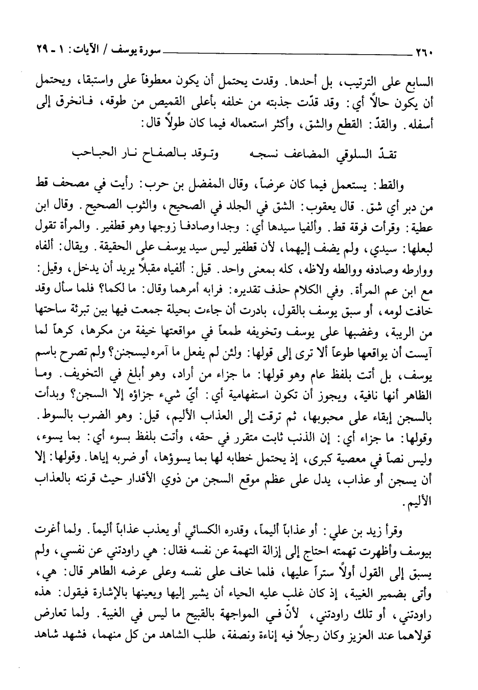 وَقَرَأَ زَيْدُ بْنُ عَلِيٍّ: أو عَذَابًا أَلِيمًا، وَقَدَّرَهُ الْكِسَائِيُّ أَوْ يُعَذَّبُ عَذَابًا أَلِيمًا. وَلَمَّا أَغْرَتْ بِيُوسُفَ وَأَظْهَرَتْ تُهْمَتَهُ احْتَاجَ إِلَى إِزَالَةِ التُّهْمَةِ عَنْ نَفْسِهِ فَقَالَ: هِيَ رَاوَدَتْنِي عَنْ نَفْسِي، وَلَمْ يَسْبِقْ إِلَى الْقَوْلِ أَوْلًا سَتْرًا عَلَيْهَا، فَلَمَّا خَافَ عَلَى نَفْسِهِ وَعَلَى عِرْضِهِ الطَّاهِرِ قَالَ: هِيَ، وَأَتَى بِضَمِيرِ الْغَيْبَةِ، إِذْ كَانَ غَلَبَ عَلَيْهِ الْحَيَاءُ أَنْ يُشِيرَ إِلَيْهَا وَيُعَيِّنَهَا بِالْإِشَارَةِ فَيَقُولُ: هَذِهِ رَاوَدَتْنِي، أو تلك راودتني، لأنّ فِي الْمُوَاجَهَةِ بِالْقَبِيحِ مَا لَيْسَ فِي الْغَيْبَةِ. وَلَمَّا تَعَارَضَ قَوْلَاهُمَا عِنْدَ الْعَزِيزِ وَكَانَ رَجُلًا فِيهِ إِنَاءَةً وَنَصْفَةً، طَلَبَ الشَّاهِدَ مِنْ كُلٍّ مِنْهُمَا، فَشَهِدَ شَاهِدٌ