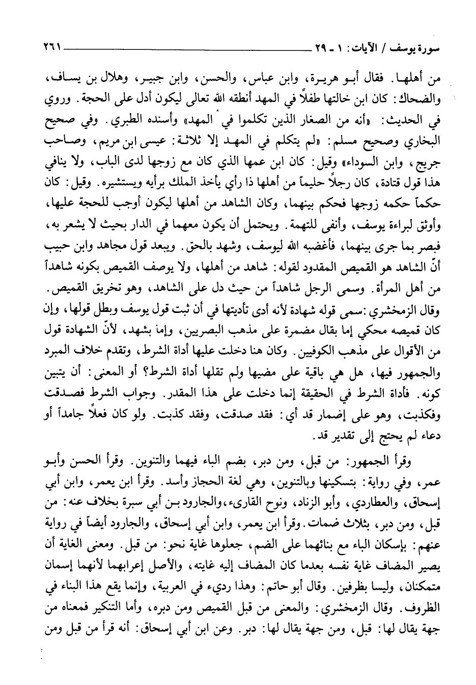 وَقَالَ الزَّمَخْشَرِيُّ: سَمَّى قَوْلَهُ شَهَادَةً لِأَنَّهُ أَدَّى تَأْدِيَتَهَا فِي أن ثَبْتِ قَوْلِ يُوسُفَ وَبَطْلِ قولها، وإن كَانَ قَمِيصُهُ مَحْكِيٌّ إِمَّا بقال مُضْمَرَةٍ عَلَى مَذْهَبِ الْبَصْرِيِّينَ، وَأَمَّا بشهد، لِأَنَّ الشَّهَادَةَ قَوْلٌ مِنَ الْأَقْوَالِ عَلَى مَذْهَبِ الْكُوفِيِّينَ. وكان هُنَا دَخَلَتْ عَلَيْهَا أَدَاةُ الشَّرْطِ، وَتَقَدَّمَ خِلَافُ الْمُبَرِّدِ وَالْجُمْهُورِ فِيهَا، هَلْ هِيَ بَاقِيَةٌ عَلَى مُضِيِّهَا وَلَمْ تقلها أَدَاةُ الشَّرْطِ؟ أَوِ الْمَعْنَى: أَنْ يَتَبَيَّنَ كَوْنَهُ. فَأَدَاةُ الشَّرْطِ فِي الْحَقِيقَةِ إِنَّمَا دَخَلَتْ عَلَى هَذَا الْمُقَدَّرِ. وجواب الشرط فصدقت وفكذبت، وَهُوَ عَلَى إِضْمَارِ قَدْ أَيْ: فَقَدْ صَدَقَتْ، وَفَقَدَ كَذَبَتْ. وَلَوْ كَانَ فِعْلًا جَامِدًا أَوْ دُعَاءً لَمْ يَحْتَجْ إِلَى تَقْدِيرِ قَدْ.