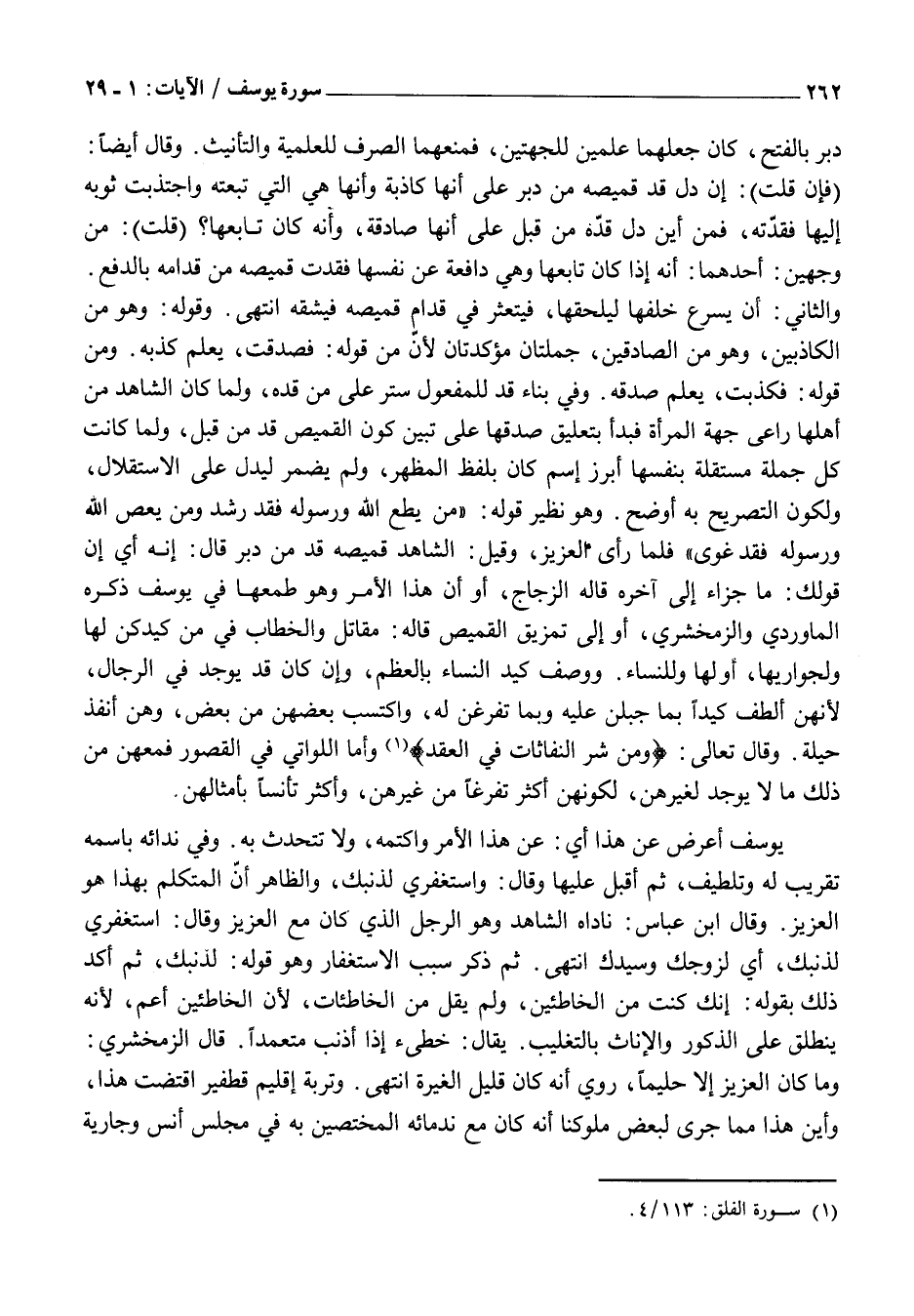 يُوسُفُ أَعْرِضْ عَنْ هَذَا أَيْ: عَنْ هَذَا الْأَمْرِ وَاكْتُمْهُ، وَلَا تَتَحَدَّثْ بِهِ. وَفِي نِدَائِهِ بِاسْمِهِ تَقْرِيبٌ لَهُ وَتَلْطِيفٌ، ثُمَّ أَقْبَلَ عَلَيْهَا وَقَالَ: وَاسْتَغْفِرِي لِذَنْبِكِ، وَالظَّاهِرُ أَنَّ الْمُتَكَلِّمَ بِهَذَا هُوَ الْعَزِيزُ. وَقَالَ ابْنُ عَبَّاسٍ: نَادَاهُ الشَّاهِدُ وَهُوَ الرَّجُلُ الَّذِي كَانَ مَعَ الْعَزِيزِ وَقَالَ: اسْتَغْفِرِي لِذَنْبِكِ، أَيْ لِزَوْجِكِ وَسَيِّدِكِ انْتَهَى. ثُمَّ ذَكَرَ سَبَبَ الِاسْتِغْفَارِ وَهُوَ قَوْلُهُ: لِذَنْبِكِ، ثُمَّ أَكَّدَ ذَلِكَ بِقَوْلِهِ: إِنَّكِ كُنْتِ مِنَ الْخَاطِئِينَ، وَلَمْ يَقُلْ مِنَ الْخَاطِئَاتِ، لِأَنَّ الْخَاطِئِينَ أَعَمُّ، لِأَنَّهُ يَنْطَلِقُ عَلَى الذُّكُورِ والإناث بالتغليب. يقال: خطىء إِذَا أَذْنَبَ مُتَعَمِّدًا. قَالَ الزَّمَخْشَرِيُّ: