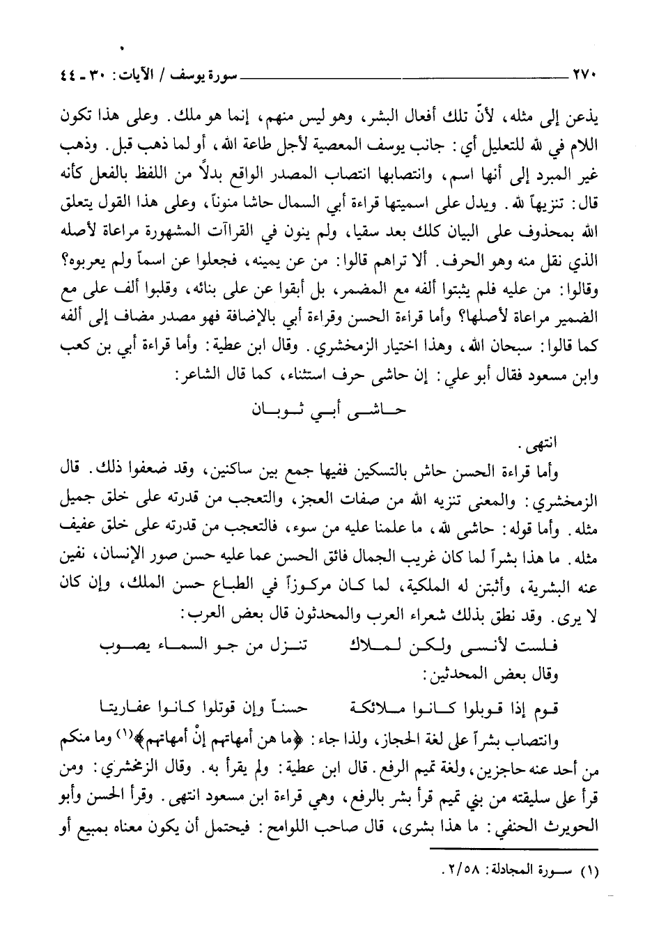 يُذْعِنَ إِلَى مِثْلِهِ، لِأَنَّ تِلْكَ أَفْعَالُ الْبَشَرِ، وَهُوَ لَيْسَ مِنْهُمْ، إِنَّمَا هُوَ مَلَكٌ. وَعَلَى هَذَا تَكُونُ اللَّامُ فِي لِلَّهِ لِلتَّعْلِيلِ أَيْ: جَانَبَ يُوسُفُ الْمَعْصِيَةَ لِأَجْلِ طَاعَةِ اللَّهِ، أَوْ لِمَا ذَهَبَ قَبْلُ. وَذَهَبَ غَيْرُ الْمُبَرِّدِ إِلَى أَنَّهَا اسْمٌ، وَانْتِصَابُهَا انْتِصَابُ الْمَصْدَرِ الْوَاقِعِ بَدَلًا مِنَ اللَّفْظِ بِالْفِعْلِ كَأَنَّهُ قَالَ: تَنْزِيهًا لِلَّهِ. وَيَدُلُّ عَلَى اسْمِيَّتِهَا قِرَاءَةُ أَبِي السَّمَّالِ حَاشًا مُنَوَّنًا، وَعَلَى هَذَا الْقَوْلِ يتعلق الله بمحذوف على البيان كلك بَعْدَ سُقْيًا، وَلَمْ يُنَوَّنْ فِي الْقِرَاآتِ الْمَشْهُورَةِ مُرَاعَاةً لِأَصْلِهِ الَّذِي نُقِلَ مِنْهُ وَهُوَ الْحَرْفُ. أَلَا تَرَاهُمْ قَالُوا: مِنْ عَنْ يَمِينِهِ، فَجَعَلُوا عَنْ اسْمًا وَلَمْ يُعْرِبُوهُ؟