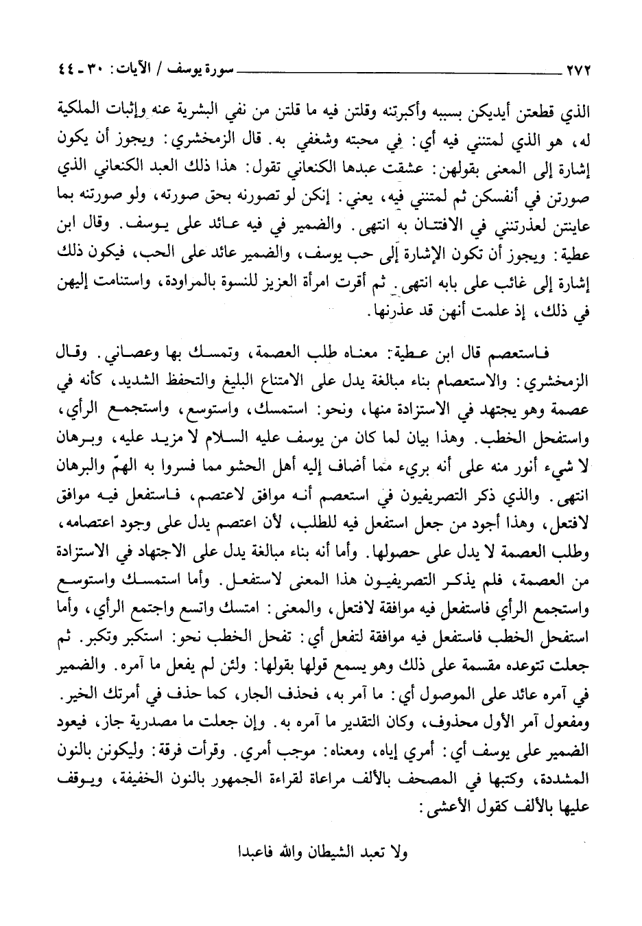 فَاسْتَعْصَمَ قَالَ ابْنُ عَطِيَّةَ: مَعْنَاهُ طَلَبَ الْعِصْمَةَ، وَتَمَسَّكَ بِهَا وَعَصَانِي. وَقَالَ الزَّمَخْشَرِيُّ: وَالِاسْتِعْصَامُ بِنَاءُ مُبَالَغَةٍ يَدُلُّ عَلَى الِامْتِنَاعِ الْبَلِيغِ وَالتَّحَفُّظِ الشَّدِيدِ، كَأَنَّهُ فِي عِصْمَةٍ وَهُوَ يَجْتَهِدُ فِي الِاسْتِزَادَةِ مِنْهَا، وَنَحْوَ: اسْتَمْسَكَ، وَاسْتَوْسَعَ، وَاسْتَجْمَعَ الرَّأْيَ، وَاسْتَفْحَلَ الْخَطْبُ. وَهَذَا بَيَانٌ لِمَا كَانَ مِنْ يُوسُفَ عَلَيْهِ السَّلَامُ لَا مَزِيدَ عَلَيْهِ، وَبُرْهَانٌ لَا شَيْءَ أَنْوَرُ مِنْهُ عَلَى أَنَّهُ بَرِيءٌ مِمَّا أَضَافَ إِلَيْهِ أَهْلُ الْحَشْوِ مِمَّا فَسَّرُوا بِهِ الْهَمَّ وَالْبُرْهَانَ انْتَهَى. وَالَّذِي ذَكَرَ التَّصْرِيفِيُّونَ فِي اسْتَعْصَمَ أَنَّهُ مُوَافِقٌ لِاعْتَصَمَ، فَاسْتَفْعَلَ فِيهِ مُوَافِقٌ لِافْتَعَلَ، وَهَذَا أَجْوَدُ مِنْ جَعْلِ اسْتَفْعَلَ فِيهِ لِلطَّلَبِ، لِأَنَّ اعْتَصَمَ يَدُلُّ عَلَى وُجُودِ اعْتِصَامِهِ، وَطَلَبَ الْعِصْمَةِ لَا يَدُلُّ عَلَى حُصُولِهَا. وَأَمَّا أَنَّهُ بِنَاءُ مُبَالَغَةٍ يَدُلُّ عَلَى الِاجْتِهَادِ فِي الِاسْتِزَادَةِ مِنَ الْعِصْمَةِ، فَلَمْ يَذْكُرِ التَّصْرِيفِيُّونَ هَذَا الْمَعْنَى لِاسْتَفْعَلَ. وَأَمَّا اسْتَمْسَكَ وَاسْتَوْسَعَ وَاسْتَجْمَعَ الرَّأْيَ فَاسْتَفْعَلَ فِيهِ مُوَافَقَةٌ لِافْتَعَلَ، وَالْمَعْنَى: امْتَسَكَ وَاتَّسَعَ وَاجْتَمَعَ الرَّأْيَ، وَأَمَّا اسْتَفْحَلَ الْخَطْبُ فَاسْتَفْعَلَ فِيهِ مُوَافَقَةٌ لِتَفَعَّلَ أَيْ: تَفَحَّلَ الْخَطْبُ نَحْوَ: اسْتَكْبَرَ وَتَكَبَّرَ. ثُمَّ جَعَلَتْ تَتَوَعَّدُهُ مُقْسِمَةً عَلَى ذَلِكَ وَهُوَ يَسْمَعُ قَوْلَهَا بِقَوْلِهَا: وَلَئِنْ لَمْ يَفْعَلْ مَا آمُرُهُ. وَالضَّمِيرُ فِي أَمْرُهُ عَائِدٌ عَلَى الْمَوْصُولِ أَيْ: مَا آمُرُ بِهِ، فَحُذِفَ الْجَارُّ، كَمَا حُذِفَ فِي أَمَرْتُكَ الْخَيْرَ.