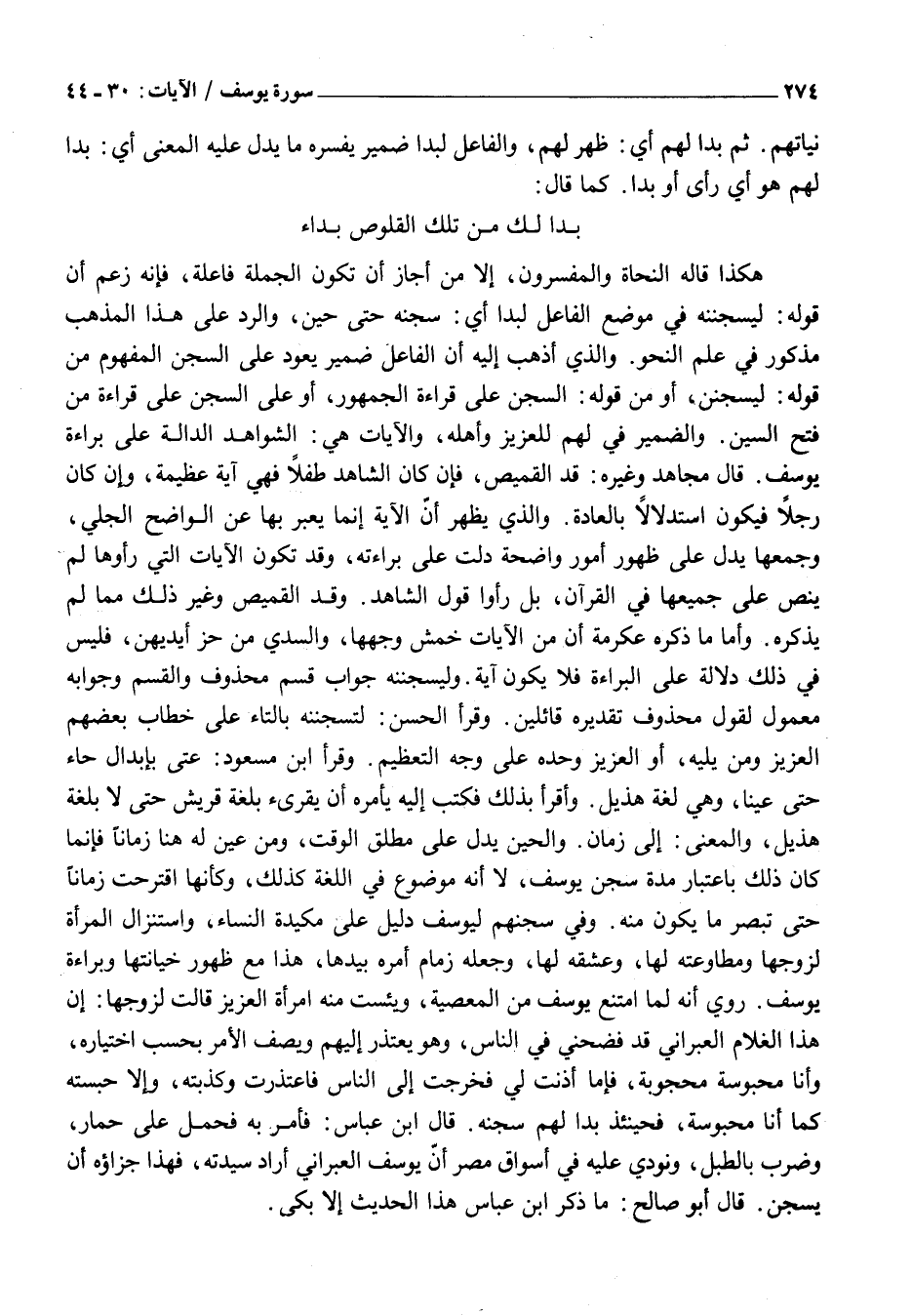 بَدَا لَكَ مِنْ تِلْكَ الْقَلُوصِ بَدَاءُ هَكَذَا قَالَهُ النُّحَاةُ وَالْمُفَسِّرُونَ، إِلَّا مَنْ أَجَازَ أَنْ تَكُونَ الْجُمْلَةُ فَاعِلَةً، فَإِنَّهُ زَعَمَ أَنَّ قَوْلَهُ: لَيَسْجُنُنَّهُ فِي مَوْضِعِ الفاعل لبدا أَيْ: سَجَنَهُ حَتَّى حِينٍ، وَالرَّدُّ عَلَى هَذَا الْمَذْهَبِ مَذْكُورٌ فِي عِلْمِ النَّحْوِ. وَالَّذِي أَذْهَبُ إِلَيْهِ أَنَّ الْفَاعِلَ ضَمِيرٌ يَعُودُ عَلَى السِّجْنِ الْمَفْهُومِ مِنْ قَوْلِهِ: لَيُسْجَنَنَّ، أَوْ مِنْ قَوْلِهِ: السِّجْنُ عَلَى قِرَاءَةِ الْجُمْهُورِ، أَوْ عَلَى السَّجْنُ عَلَى قِرَاءَةِ مَنْ فَتَحَ السِّينَ. وَالضَّمِيرُ فِي لَهُمْ لِلْعَزِيزِ وأهله، والآيات هِيَ: الشَّوَاهِدُ الدَّالَّةُ عَلَى بَرَاءَةِ يُوسُفَ. قَالَ مُجَاهِدٌ وَغَيْرُهُ: قَدُّ الْقَمِيصِ، فَإِنْ كَانَ الشَّاهِدُ طِفْلًا فَهِيَ آيَةٌ عَظِيمَةٌ، وَإِنْ كَانَ رَجُلًا فَيَكُونُ اسْتِدْلَالًا بِالْعَادَةِ. وَالَّذِي يَظْهَرُ أَنَّ الْآيَةَ إِنَّمَا يُعَبَّرُ بِهَا عَنِ الْوَاضِحِ الْجَلِيِّ، وَجَمْعُهَا يَدُلُّ عَلَى ظُهُورِ أُمُورٍ وَاضِحَةٍ دَلَّتْ عَلَى بَرَاءَتِهِ، وَقَدْ تَكُونُ الْآيَاتُ الَّتِي رَأَوْهَا لَمْ يَنُصَّ عَلَى جَمِيعِهَا فِي الْقُرْآنِ، بَلْ رَأَوْا قَوْلَ الشَّاهِدِ. وَقَدَّ الْقَمِيصِ وَغَيْرِ ذَلِكَ مِمَّا لَمْ يَذْكُرْهُ. وَأَمَّا مَا ذَكَرَهُ عِكْرِمَةُ أَنَّ مِنَ الْآيَاتِ خَمْشُ وَجْهِهَا، وَالسُّدِّيُّ مِنْ حَزِّ أَيْدِيهِنَّ، فَلَيْسَ فِي ذَلِكَ دَلَالَةٌ عَلَى الْبَرَاءَةِ فلا يكون آية. وليسجننه جَوَابُ قَسَمٍ مَحْذُوفٍ وَالْقَسَمُ وَجَوَابُهُ مَعْمُولٌ لِقَوْلٍ مَحْذُوفٍ تَقْدِيرُهُ قَائِلِينَ. وَقَرَأَ الْحَسَنُ: لَتَسْجُنُنَّهُ بِالتَّاءِ عَلَى خِطَابِ بَعْضِهِمُ الْعَزِيزَ وَمَنْ يَلِيهِ، أَوِ الْعَزِيزَ وَحْدَهُ عَلَى وَجْهِ التَّعْظِيمِ. وَقَرَأَ ابْنُ مَسْعُودٍ: عَتَّى بِإِبْدَالِ حَاءِ حَتَّى عَيْنًا، وَهِيَ لُغَةُ هُذَيْلٍ. وَأَقْرَأَ بِذَلِكَ فَكَتَبَ إليه يأمره أن يقرىء بِلُغَةِ قُرَيْشٍ حَتَّى لَا بِلُغَةِ هُذَيْلٍ، وَالْمَعْنَى: إِلَى زَمَانٍ. وَالْحِينُ يَدُلُّ عَلَى مُطْلَقِ الْوَقْتِ، وَمَنْ عَيَّنَ لَهُ هُنَا زَمَانًا فَإِنَّمَا كَانَ ذَلِكَ بِاعْتِبَارِ مُدَّةِ سِجْنِ يُوسُفَ، لَا أَنَّهُ مَوْضُوعٌ فِي اللُّغَةِ كَذَلِكَ، وَكَأَنَّهَا اقْتَرَحَتْ زَمَانًا حَتَّى تُبْصِرَ مَا يَكُونُ مِنْهُ. وَفِي سَجْنِهِمْ لِيُوسُفَ دَلِيلٌ عَلَى مَكِيدَةِ النِّسَاءِ، وَاسْتِنْزَالُ الْمَرْأَةِ لِزَوْجِهَا وَمُطَاوَعَتِهِ لَهَا، وَعِشْقِهِ لَهَا، وَجَعْلِهِ زِمَامَ أَمْرِهِ بِيَدِهَا، هَذَا مَعَ ظُهُورِ خِيَانَتِهَا وَبَرَاءَةِ يُوسُفَ.