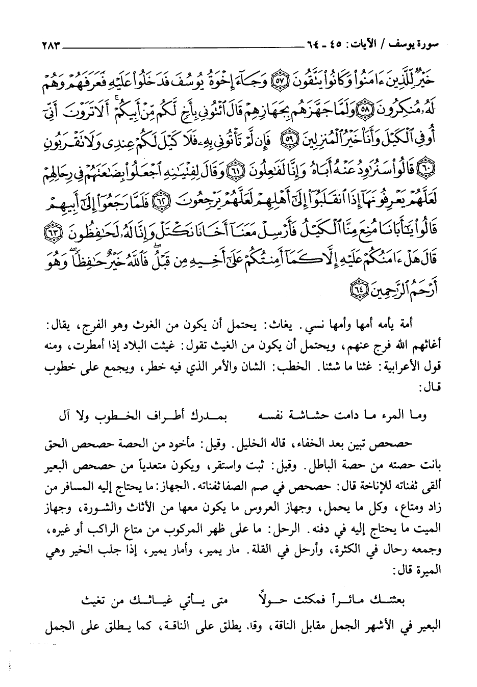 حَصْحَصَ تَبَيَّنَ بَعْدَ الْخَفَاءِ، قَالَهُ الْخَلِيلُ. وَقِيلَ: مَأْخُوذٌ مِنَ الْحِصَّةِ حَصْحَصَ الْحَقُّ بَانَتْ حِصَّتُهُ مِنْ حِصَّةِ الْبَاطِلِ. وَقِيلَ: ثَبَتَ وَاسْتَقَرَّ، وَيَكُونُ مُتَعَدِّيًا مِنْ حَصْحَصَ الْبَعِيرُ أَلْقَى ثَفِنَاتِهِ لِلْإِنَاخَةِ قَالَ: حَصْحَصَ فِي صُمِّ الصَّفَا ثَفِنَاتِهِ. الْجِهَازُ: مَا يَحْتَاجُ إِلَيْهِ الْمُسَافِرُ مِنْ زَادٍ وَمَتَاعٍ، وَكُلُّ مَا يُحْمَلُ، وَجِهَازُ الْعَرُوسِ مَا يَكُونُ مَعَهَا مِنَ الْأَثَاثِ وَالشُّورَةِ، وَجِهَازُ الْمَيِّتِ مَا يُحْتَاجُ إِلَيْهِ فِي دَفْنِهِ. الرَّحْلُ: مَا عَلَى ظَهْرِ الْمَرْكُوبِ مِنْ مَتَاعِ الرَّاكِبِ أَوْ غَيْرِهِ، وَجَمْعُهُ رِحَالٌ فِي الْكَثْرَةِ، وَأَرْحُلٌ فِي الْقِلَّةِ. مَارَ يَمِيرُ، وَأَمَارَ يَمِيرُ، إِذَا جَلَبَ الْخَيْرَ وَهِيَ الْمِيرَةُ قَالَ: