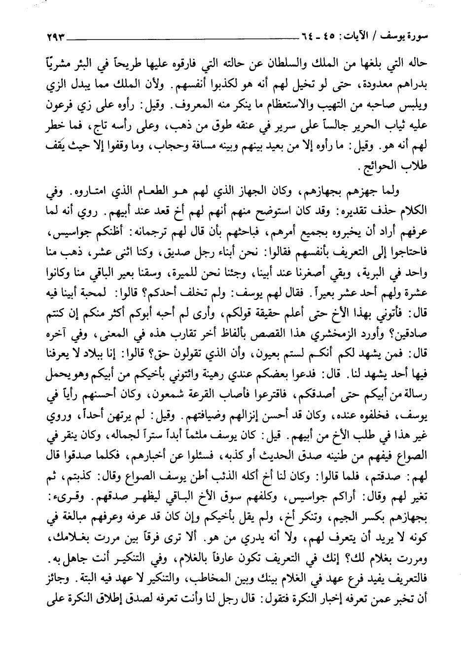 بِجِهَازِهِمْ بِكَسْرِ الْجِيمِ، وَتَنَكَّرَ أَخٌ، وَلَمْ يَقُلْ بِأَخِيكُمْ وَإِنْ كَانَ قَدْ عَرَّفَهُ وعرفهم مُبَالَغَةً فِي كَوْنِهِ لَا يُرِيدُ أَنْ يَتَعَرَّفَ لَهُمْ، وَلَا أَنَّهُ يُدْرِي مَنْ هُوَ. أَلَا تَرَى فَرْقًا بَيْنَ مَرَرْتُ بِغُلَامِكَ، وَمَرَرْتُ بِغُلَامٍ لَكَ؟ إِنَّكَ فِي التَّعْرِيفِ تَكُونُ عَارِفًا بِالْغُلَامِ، وَفِي التَّنْكِيرِ أَنْتَ جَاهِلٌ بِهِ.