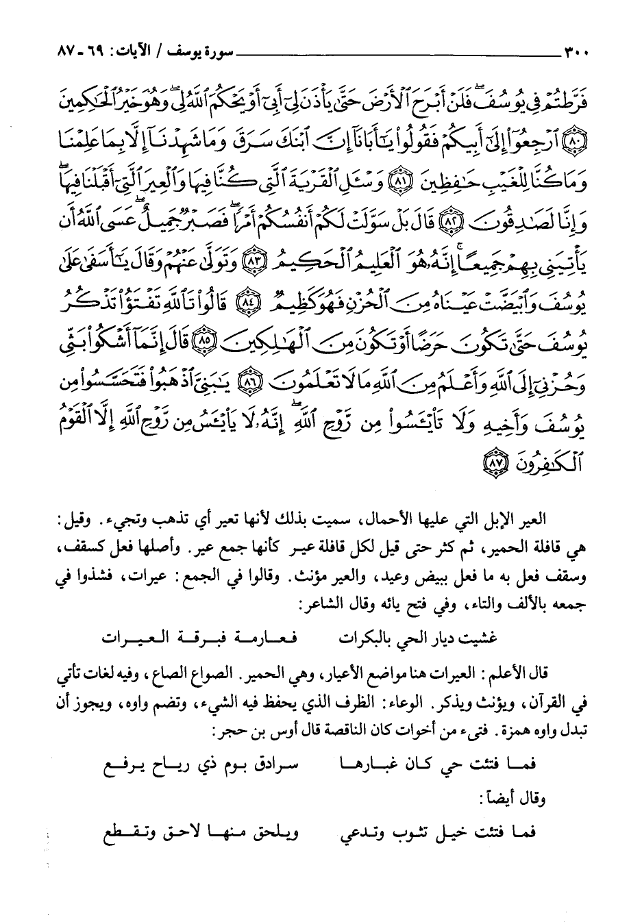 قَالَ الأعلم: العيرات هُنَا مَوَاضِعُ الْأَعْيَارِ، وَهِيَ الْحَمِيرُ. الصُّوَاعُ الصَّاعُ، وَفِيهِ لُغَاتٌ تَأْتِي فِي الْقُرْآنِ، وَيُؤَنَّثُ وَيُذَكَّرُ. الْوِعَاءُ: الظَّرْفُ الَّذِي يُحْفَظُ فِيهِ الشَّيْءُ، وَتُضَمُّ وَاوُهُ، وَيَجُوزُ أَنْ تبدل واوه همزة. فتى؟؟؟ أَخَوَاتِ كَانَ النَّاقِصَةِ قَالَ أَوْسُ بْنُ حَجَرٍ: