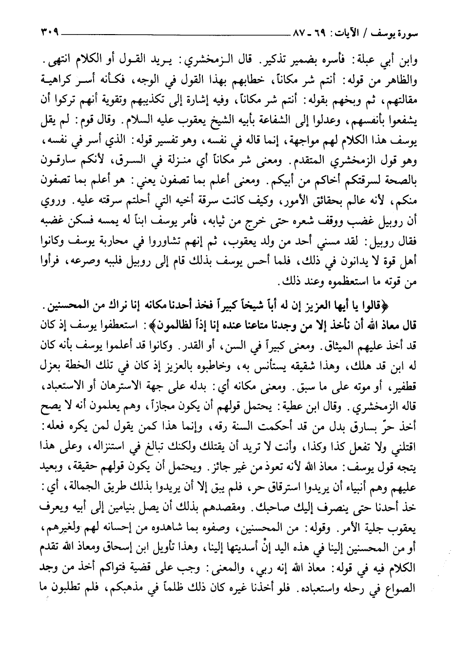 قالُوا يَا أَيُّهَا الْعَزِيزُ إِنَّ لَهُ أَباً شَيْخاً كَبِيراً فَخُذْ أَحَدَنا مَكانَهُ إِنَّا نَراكَ مِنَ الْمُحْسِنِينَ. قالَ مَعاذَ اللَّهِ أَنْ نَأْخُذَ إِلَّا مَنْ وَجَدْنا مَتاعَنا عِنْدَهُ إِنَّا إِذاً لَظالِمُونَ: اسْتَعْطَفُوا يُوسُفَ إِذْ كَانَ قَدْ أُخِذَ عَلَيْهِمُ الْمِيثَاقُ. وَمَعْنَى كَبِيرًا فِي السِّنِّ، أَوِ الْقَدْرِ. وَكَانُوا قَدْ أَعْلَمُوا يُوسُفَ بِأَنَّهُ كَانَ لَهُ ابْنٌ قَدْ هَلَكَ، وَهَذَا شَقِيقُهُ يَسْتَأْنِسُ بِهِ، وَخَاطَبُوهُ بِالْعَزِيزِ إِذْ كَانَ فِي تِلْكَ الْخُطَّةِ بِعَزْلِ قِطْفِيرَ، أَوْ مَوْتِهِ عَلَى مَا سَبَقَ. وَمَعْنَى مَكَانَهُ أَيْ: بَدَلَهُ عَلَى جِهَةِ الِاسْتِرْهَانِ أَوِ الِاسْتِعْبَادِ، قَالَهُ الزَّمَخْشَرِيُّ. وَقَالَ ابْنُ عطية: يُحْتَمَلُ قَوْلُهُمْ أَنْ يَكُونَ مَجَازًا، وَهُمْ يَعْلَمُونَ أَنَّهُ لَا يَصِحُّ أَخْذُ حُرٍّ بِسَارِقٍ بَدَلَ مَنْ قَدْ أَحْكَمَتِ السُّنَّةُ رِقَّهُ، وَإِنَّمَا هَذَا كَمَنَ يَقُولُ لِمَنْ يُكْرَهُ فِعْلُهُ: