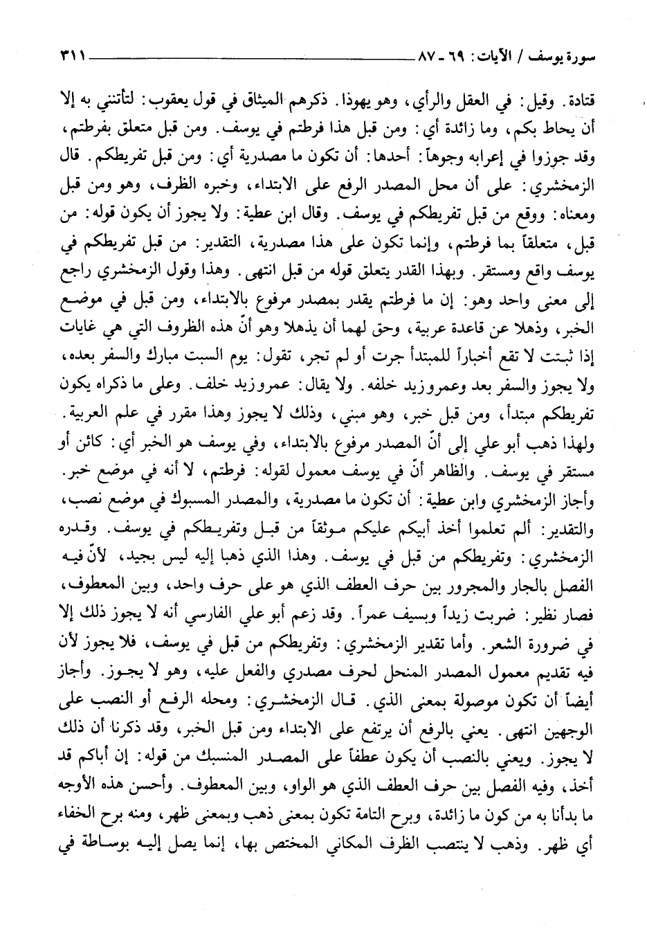 قَتَادَةُ. وَقِيلَ: فِي الْعَقْلِ وَالرَّأْيِ، وَهُوَ يَهُوذَا. ذَكَّرَهُمُ الْمِيثَاقَ فِي قَوْلِ يَعْقُوبَ: لَتَأْتُنَّنِي بِهِ إِلَّا أَنْ يحاط بكم، وما زَائِدَةٌ أَيْ: وَمِنْ قَبْلِ هَذَا فَرَّطْتُمْ فِي يُوسُفَ. ومن قبل متعلق بفرطتم، وَقَدْ جَوَّزُوا فِي إِعْرَابِهِ وُجُوهًا: أَحَدُهَا: أَنْ تَكُونَ مَا مَصْدَرِيَّةً أَيْ: وَمِنْ قَبْلُ تَفْرِيطُكُمْ. قَالَ الزَّمَخْشَرِيُّ: عَلَى أَنَّ مَحَلَّ الْمَصْدَرِ الرَّفْعُ عَلَى الِابْتِدَاءِ، وَخَبَرُهُ الظَّرْفُ، وَهُوَ وَمِنْ قَبْلُ وَمَعْنَاهُ: وَوَقَعَ مِنْ قَبْلُ تَفْرِيطُكُمْ فِي يُوسُفَ. وَقَالَ ابْنُ عَطِيَّةَ: وَلَا يَجُوزُ أَنْ يَكُونَ قَوْلُهُ: مِنْ قبل، متعلقا بما فَرَّطْتُمْ، وَإِنَّمَا تَكُونُ عَلَى هَذَا مَصْدَرِيَّةً، التَّقْدِيرُ: مِنْ قَبْلُ تَفْرِيطُكُمْ فِي يُوسُفَ وَاقِعٌ وَمُسْتَقِرٌّ. وَبِهَذَا الْقَدْرِ يَتَعَلَّقُ قَوْلُهُ مِنْ قَبْلُ انْتَهَى. وَهَذَا وَقَوْلُ الزَّمَخْشَرِيِّ رَاجِعٌ إِلَى مَعْنًى وَاحِدٍ وَهُوَ: إِنَّ مَا فَرَّطْتُمْ يُقَدَّرُ بِمَصْدَرٍ مَرْفُوعٍ بِالِابْتِدَاءِ، ومن قَبْلُ فِي مَوْضِعِ الْخَبَرِ، وَذَهْلًا عَنْ قَاعِدَةٍ عَرَبِيَّةٍ، وَحَقَّ لَهُمَا أَنْ يَذْهَلَا وَهُوَ أَنَّ هَذِهِ الظُّرُوفَ الَّتِي هِيَ غَايَاتٌ إِذَا ثَبَتَتْ لَا تَقَعُ أَخْبَارًا لِلْمُبْتَدَأِ جُرَّتْ أَوْ لَمْ تُجَرَّ، تَقُولُ: يَوْمُ السَّبْتِ مُبَارَكٌ وَالسَّفَرُ بَعْدَهُ، وَلَا يجوز والسفر بعد وعمرو زيد خلفه. ولا يقال: عمرو زيد خَلْفُ. وَعَلَى مَا ذَكَرَاهُ يكون تفريطكم مبتدأ، ومن قَبْلُ خَبَرٌ، وَهُوَ مَبْنِيٌّ، وَذَلِكَ لَا يَجُوزُ وَهَذَا مُقَرَّرٌ فِي عِلْمِ الْعَرَبِيَّةِ.